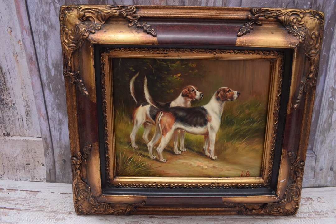 Дві мисливські собаки - собаки - картина маслом - золота рамка 47x42