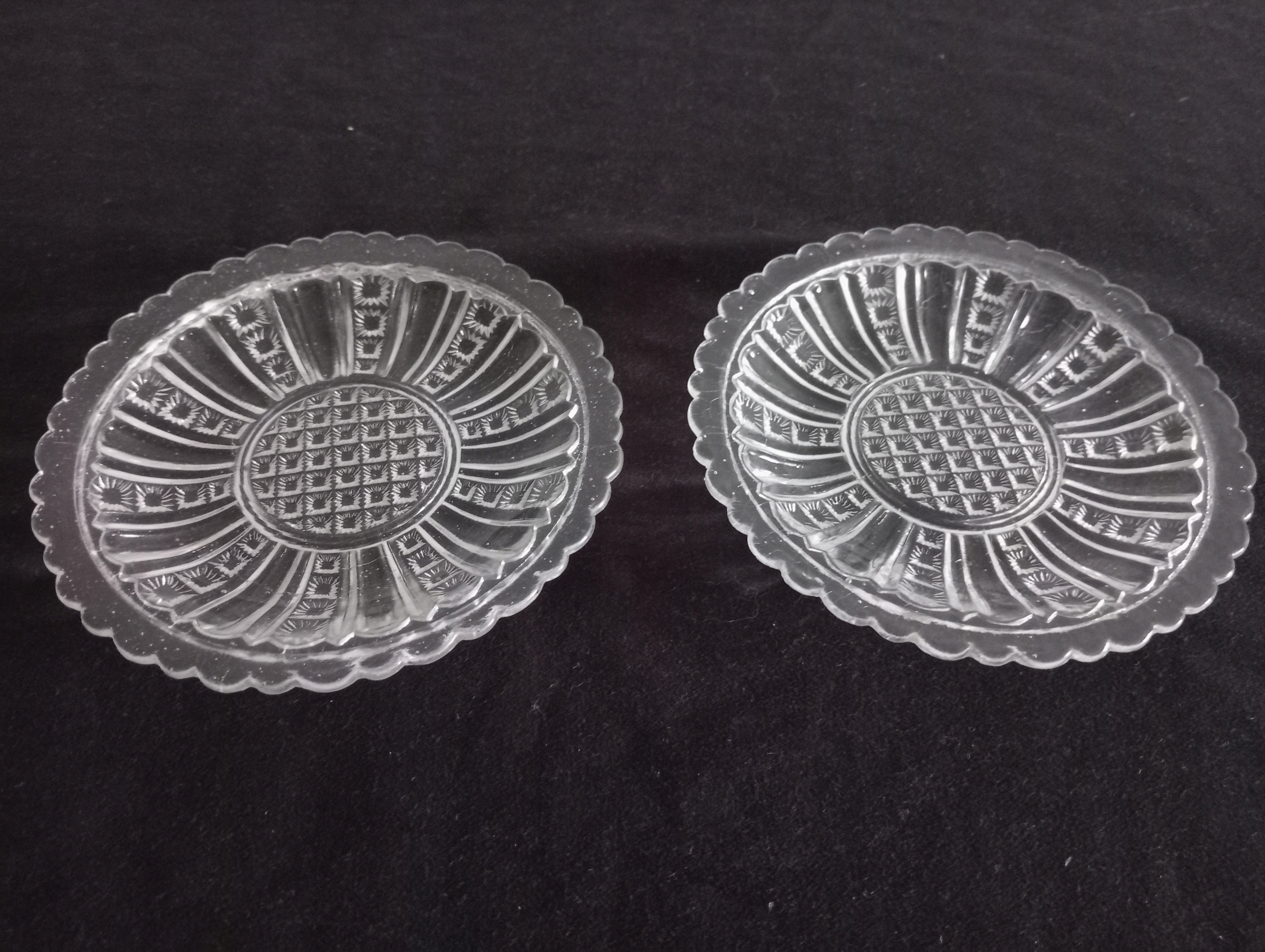 Дві тарілки з пресованого скла до -воєн, ймовірно, одна з німецьких сталевих виробів
