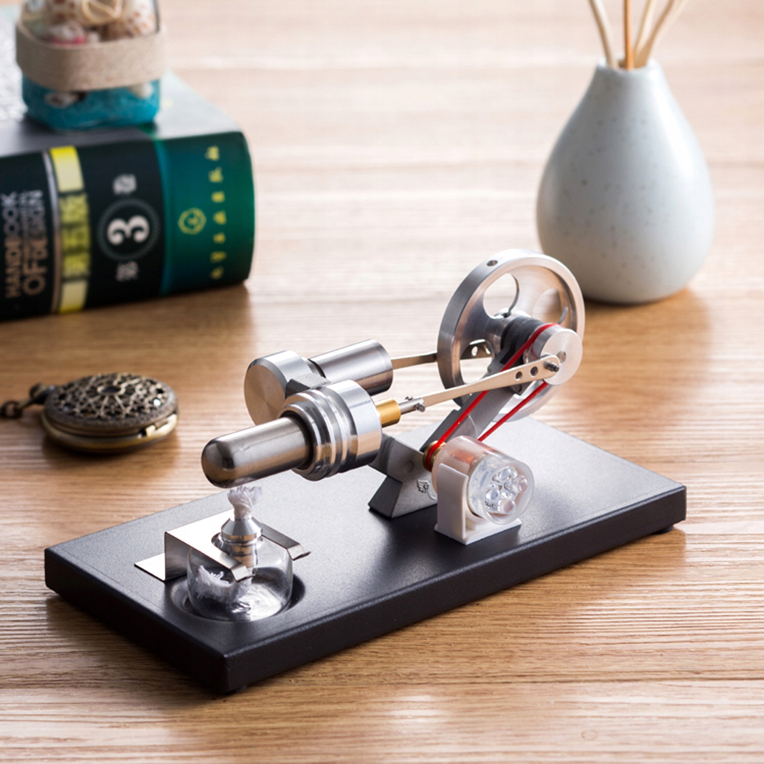 Основа виготовлена з металу, вишукана та красива. Кронштейн використовує матеріал зі сплаву цинку, який є стабільним і міцним. Маховик, гільза циліндра та ведучий поршень мають алюмінієвий сплав, фінішне фрезерування.