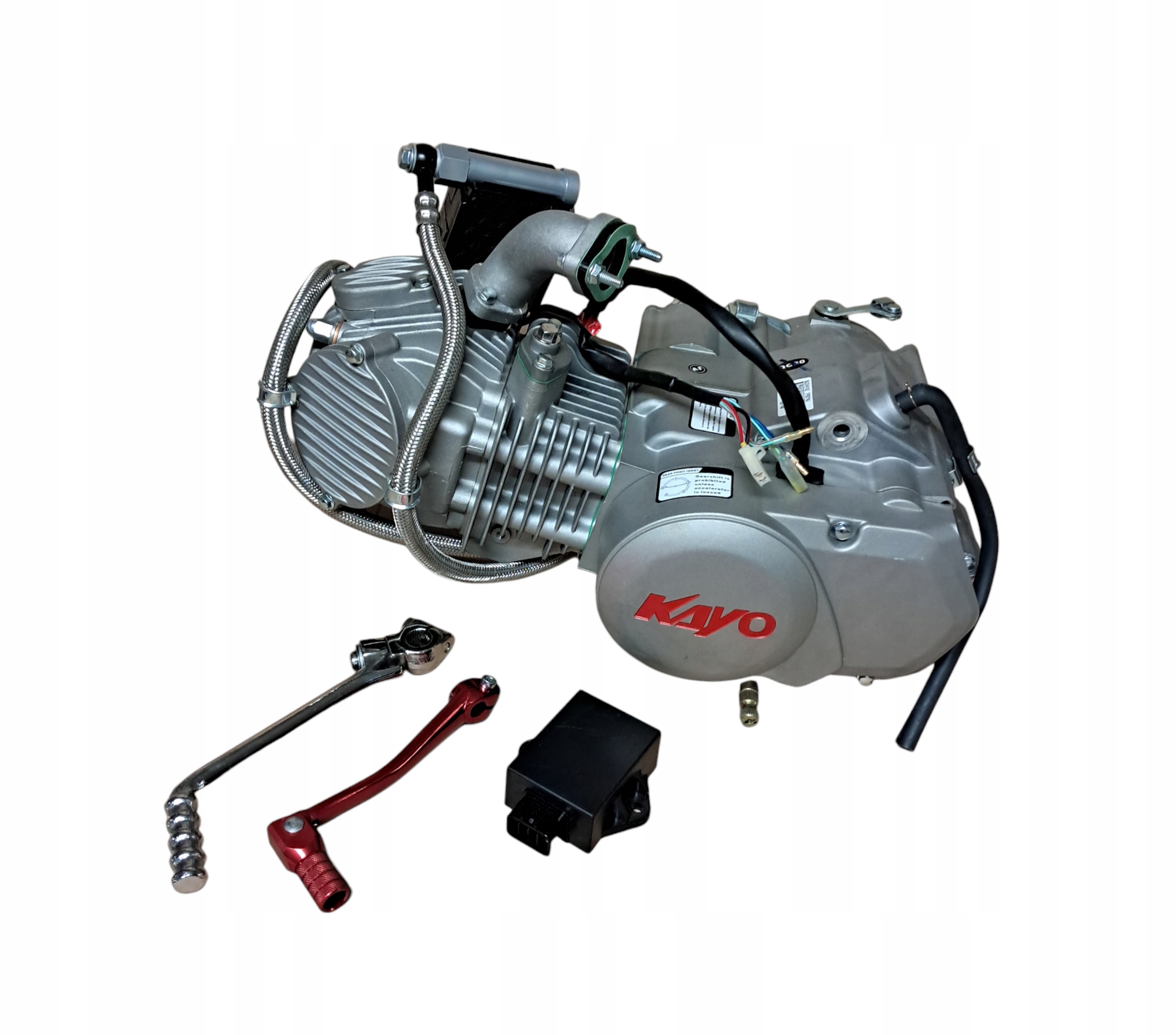 В набір входять всі елементи з фото, а саме: червоний алюмінієвий важіль коробки передач, модуль, вихлопна труба, великий ефективний масляний радіатор, роз'єм з прокладками та розпіркою, а також гвинти кріплення карбюратора. Вихідна зірочка 16T для ланцюга 428.
