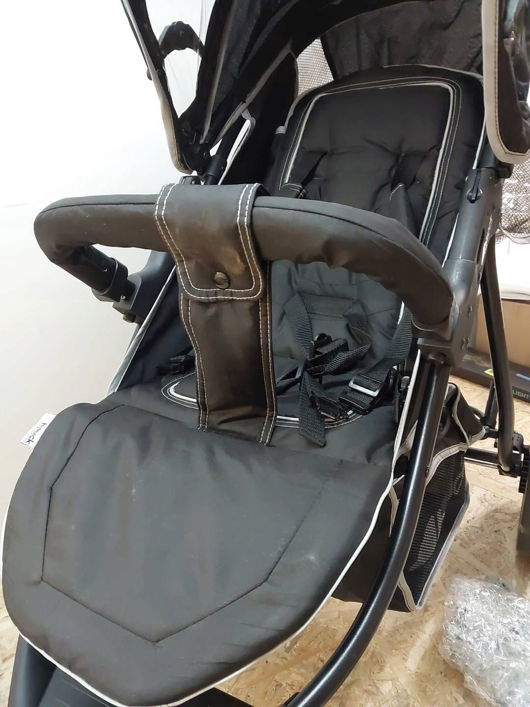 Він має три великі колеса, завдяки яким коляска пересувається легко та маневрено. Переднє колесо може обертатися на 360 градусів і може бути заблоковано. Ручка регулюється по висоті, в колясці є велика корзина для покупок, регульована підніжка і спинка. Спинку заднього сидіння можна відрегулювати до положення відпочинку.