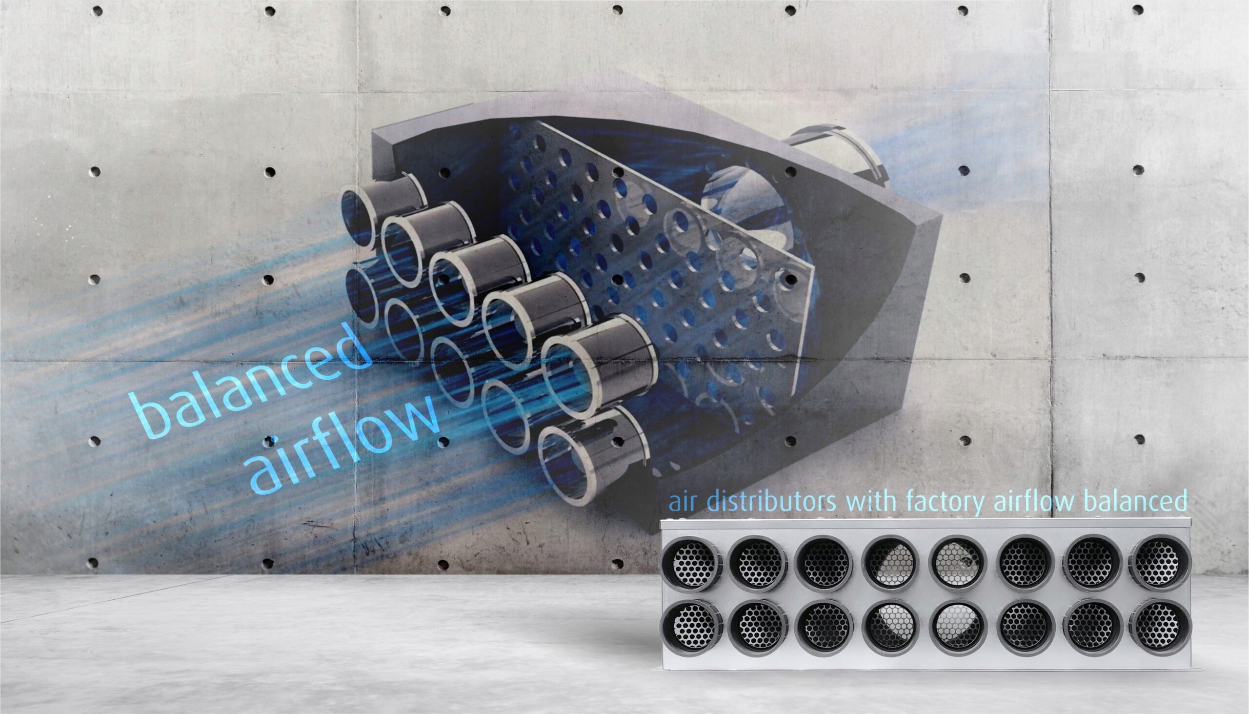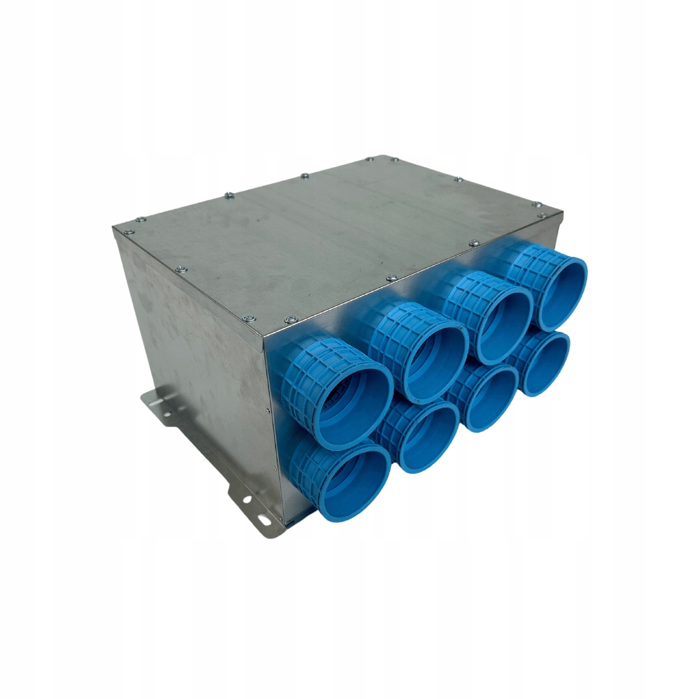2-рядковий самокірінг, внутрішньо ізольований (10 мм) круїзний дистриб'ютор з підключеннями короткого діапазону. Колектор, оснащений гумовими з'єднувальними з'єднаннями ( ⌀ 75) для карбетних труб (спектрів). Олов'яні елементи колектора тіла поєднуються за допомогою холодного пресування.