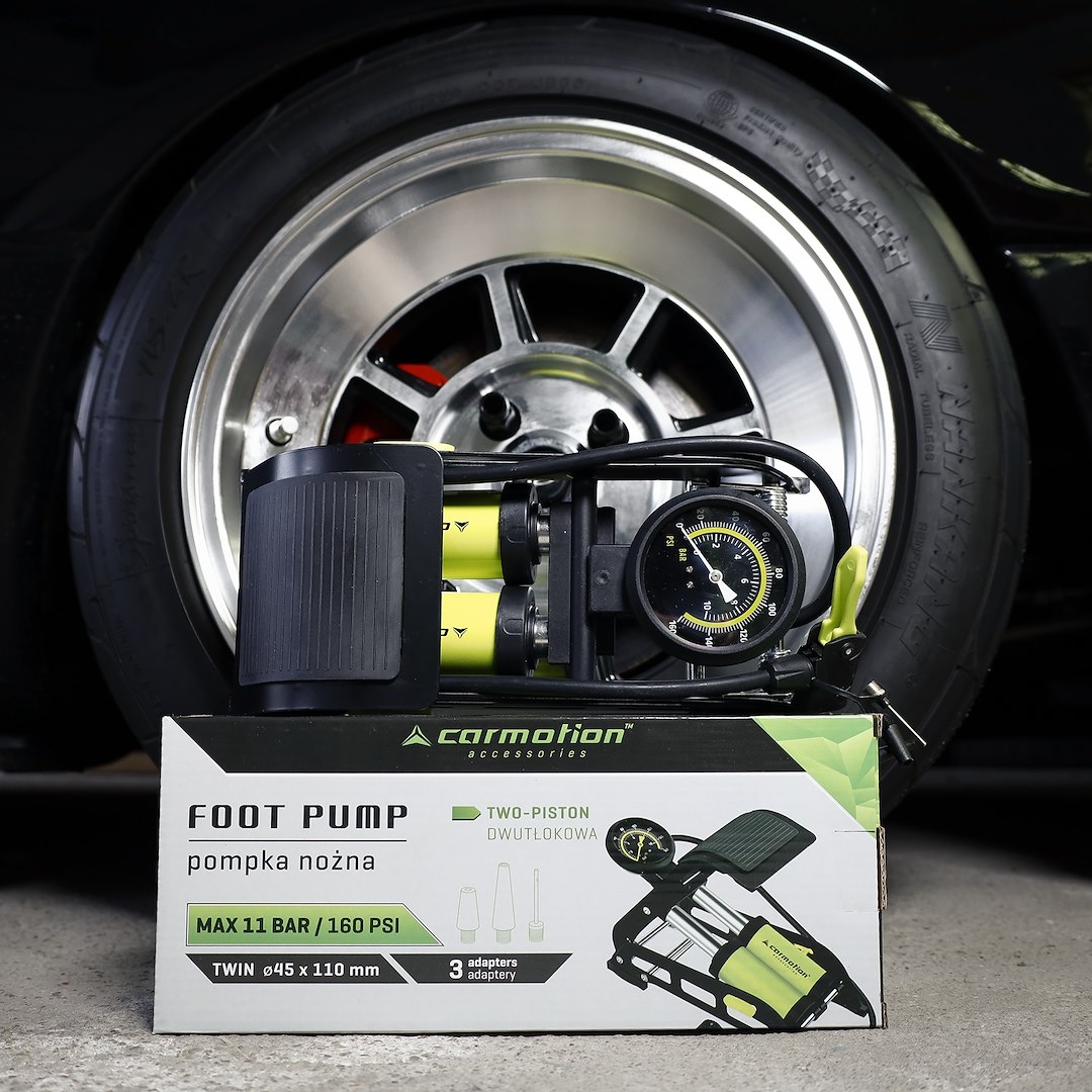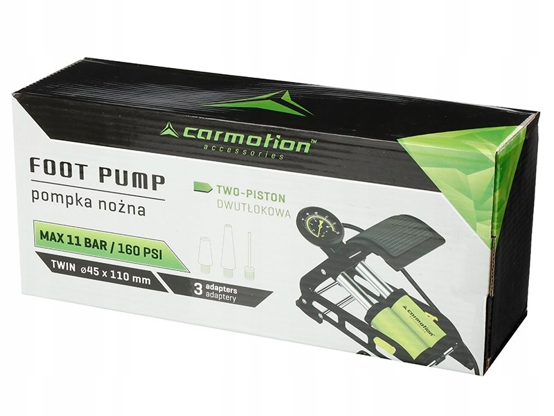насос подвійного -клопця з аналоговим -оналога -монітором артеріального тиску до 11 бар (160 фунтів на дюйм). Оснащений шлангом довжиною 68 см з багатофункціональною наконечником. Набір включає три насосні адаптери.