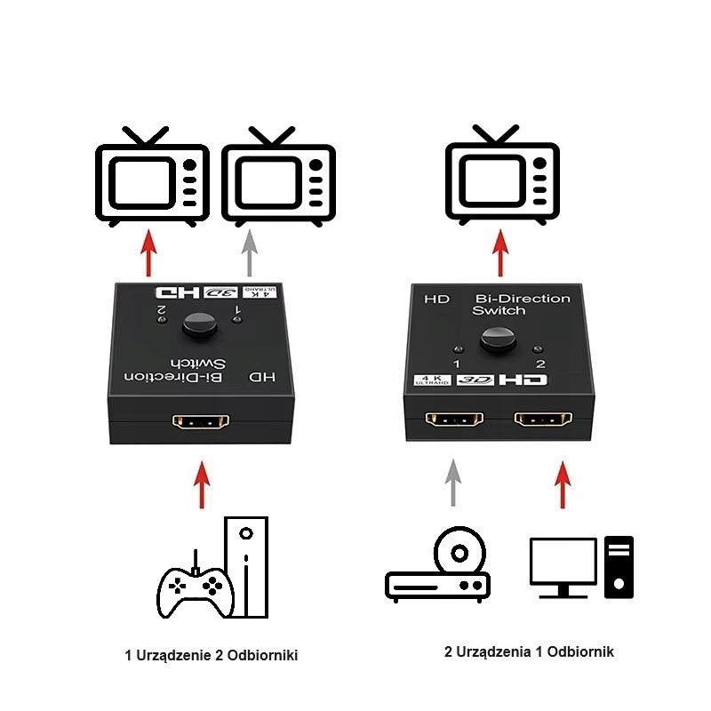 Перемикач 2-1 чудово підходить для домашніх та професійних додатків, де необхідно відтворювати або часто перемикати відео та аудіосигнали. Завдяки цьому невеликому пристрою ви можете насолоджуватися високою якістю переданого сигналу без необхідності постійного фізичного перемикання кабелю. Switch 2-1-це пристрій Plug & Play, завдяки якому його робота надзвичайно проста і не потребує складної конфігурації. Пристрій не повинен живитися зовні - для належної роботи все, що вам потрібно, - це струм, що передається кабелем HDMI.