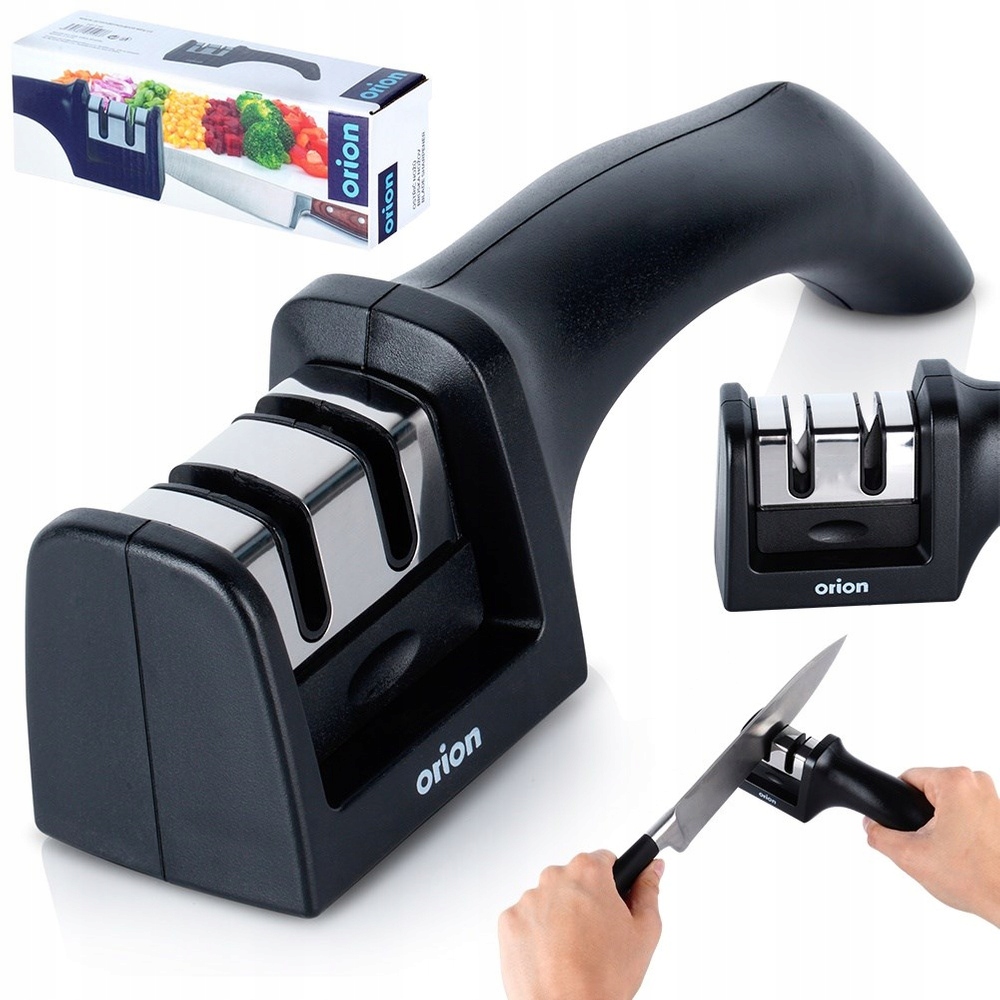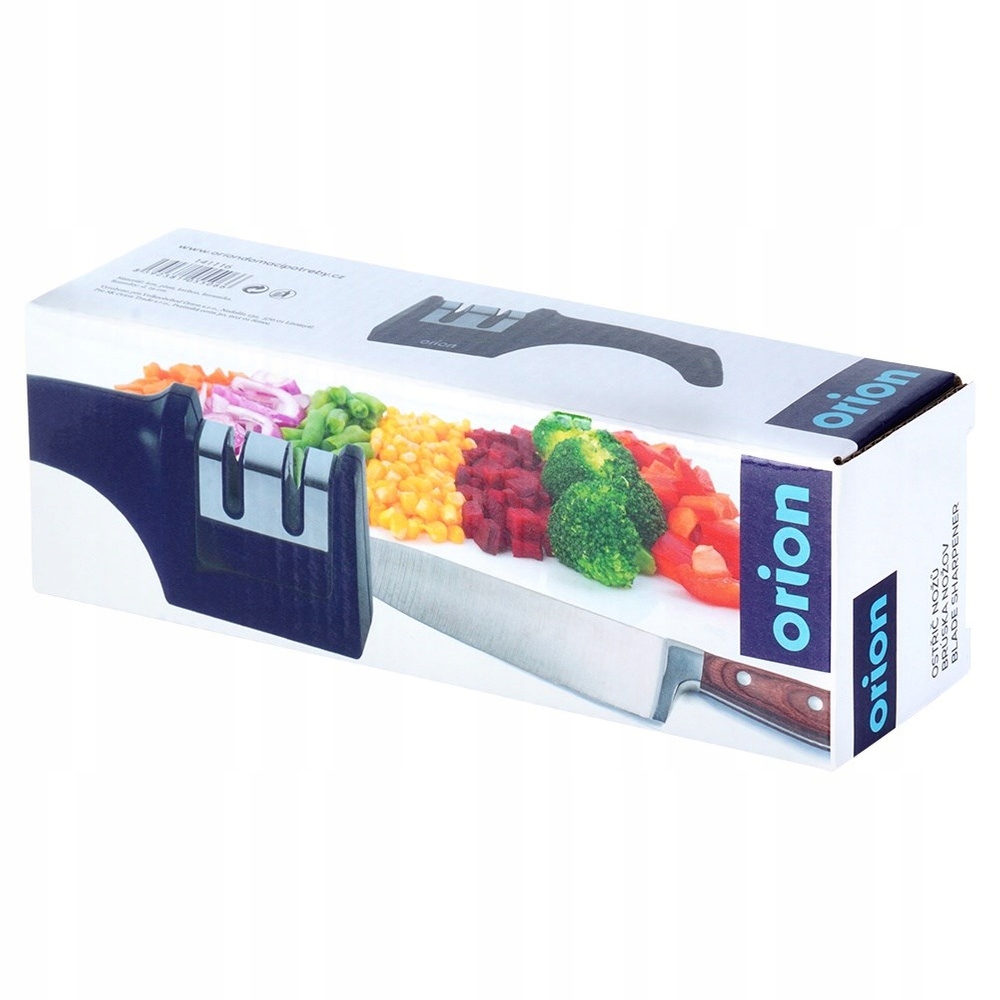 Двоступенева точилка для ножів. Підходить для ножів без зубців і керамічних лез. З його допомогою ми можемо заточити будь-який ніж, коли він вже затупився. Має зручну ручку, яка забезпечує комфортне використання. Нековзка основа гарантує, що точило добре прилягає до стільниці. Завдяки точилці ножі залишаються гострими до шести місяців. Оригінальна продукція чеського бренду Orion. Виготовлена за європейськими стандартами.