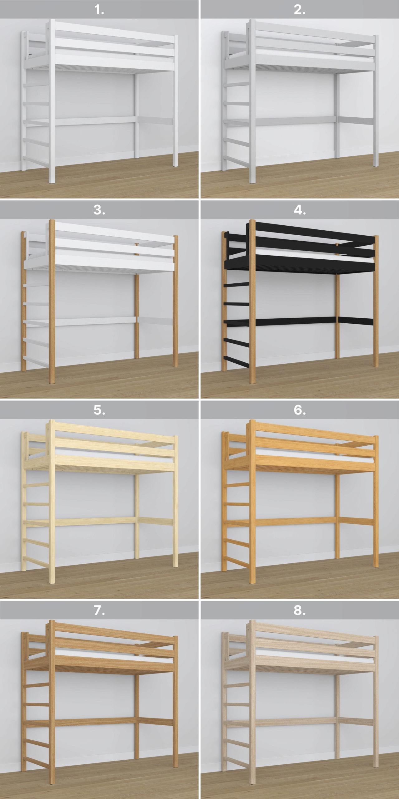 1. Білий | 2. Сірий | 3. Білий дуб | 4. Чорний дуб | 5. Сосна безбарвна | 6. Натуральна сосна | 7. Дуб натуральний | 8. Дуб вибілений