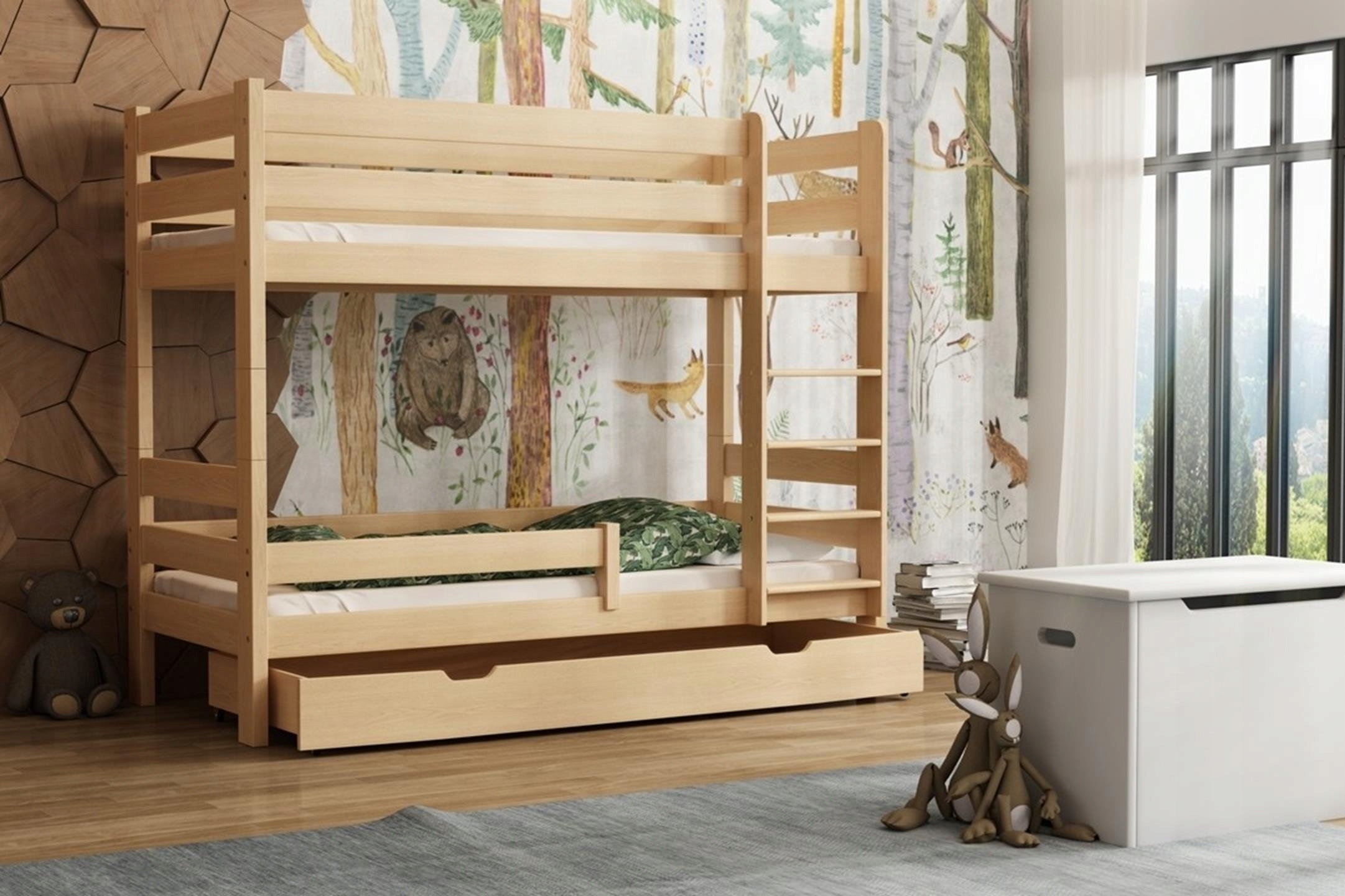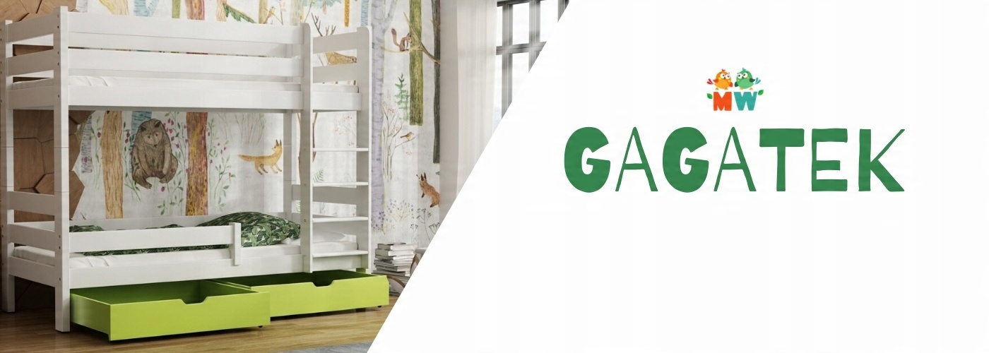 GAGATEK - двоярусне ліжко, повністю виготовлене з високоякісної деревини сосни. Він ідеально підходить для кімнати брата або сестри, коли вам потрібно оптимально використовувати простір, який поділяють ваші діти. Захисні дерев'яні перила захищають від падінь, а діти можуть безпечно та зручно підніматися по драбині з плоскими щаблями. Також можна використовувати GAGATKA як два окремих ліжка. Ліжко можна складати та розкладати багато разів без шкоди для його міцності та естетики