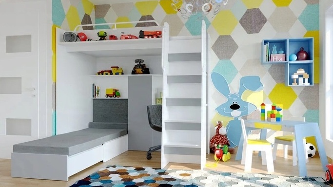 Двох'ярусне ліжко Мікі з диваном-ліжком і письмовим столом