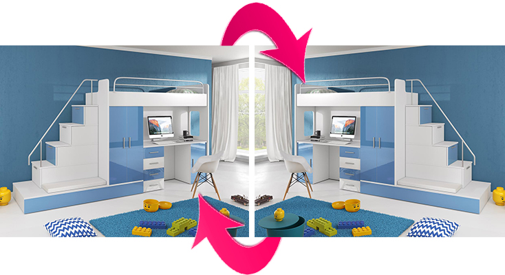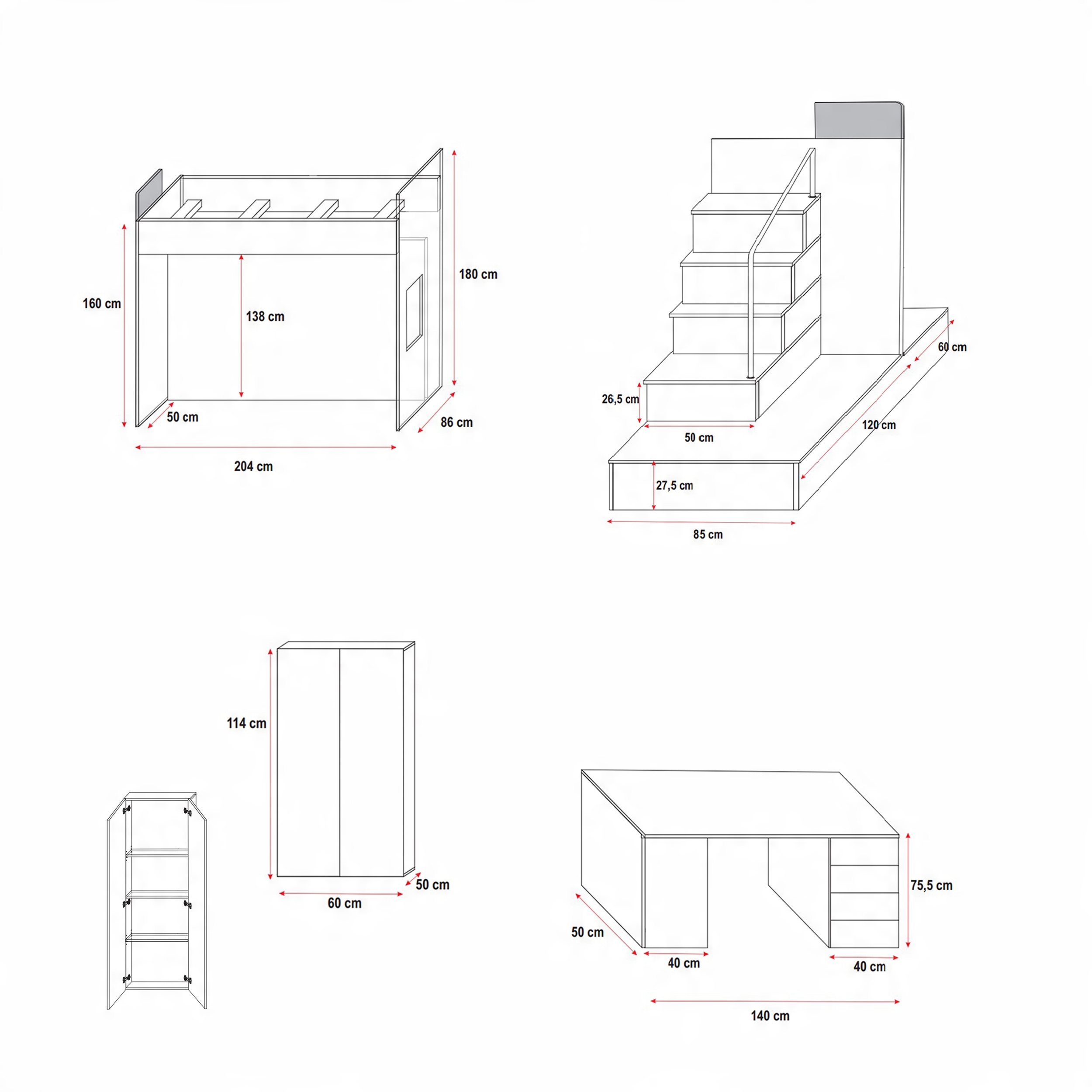 Ліжко характеризується сучасним дизайном і точною виготовленням, що забезпечує винятково хороший сон і гарантію безпеки і впевненості, що ваша дитина прокинеться відпочилою. Фасади гарнітура виготовлені з глянцевої меблевої плити МДФ насичених кольорів, що дозволить підібрати меблі до будь-якої кімнати. Верхня поверхня для сну та сходинки біля ліжка оснащені поручнями, щоб захистити дитину від випадання.