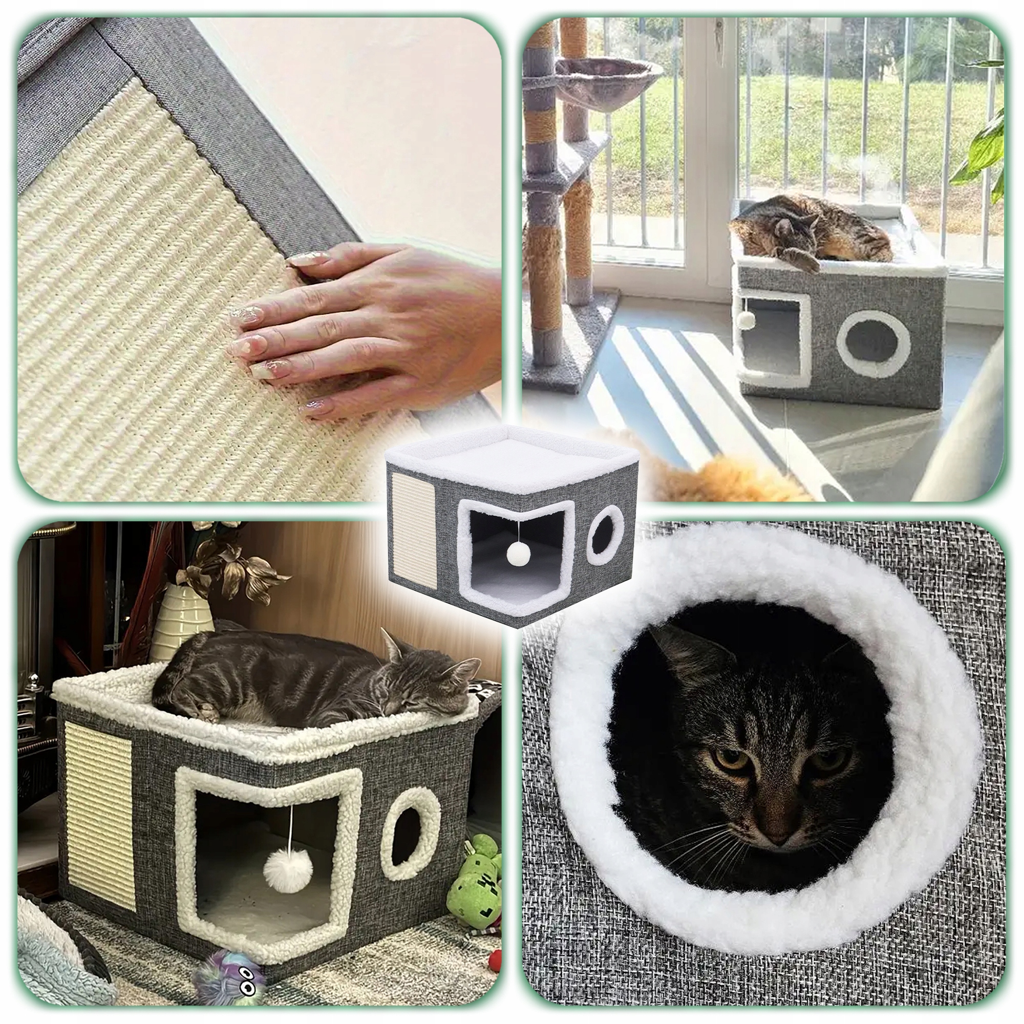 СКЛАДНИЙ ДВОПОВЕРХОВИЙ БУДИНОК ДЛЯ КОТІВ - СІРИЙ З ПЛЮШЕМ 42×42×31 см