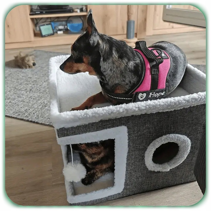 Цей дворівневий будиночок - ідеальне рішення для котів, які люблять як спокійний сон, так і активні ігри. Завдяки складній конструкції ви легко зіберете його та впишете в будь-який інтер'єр.