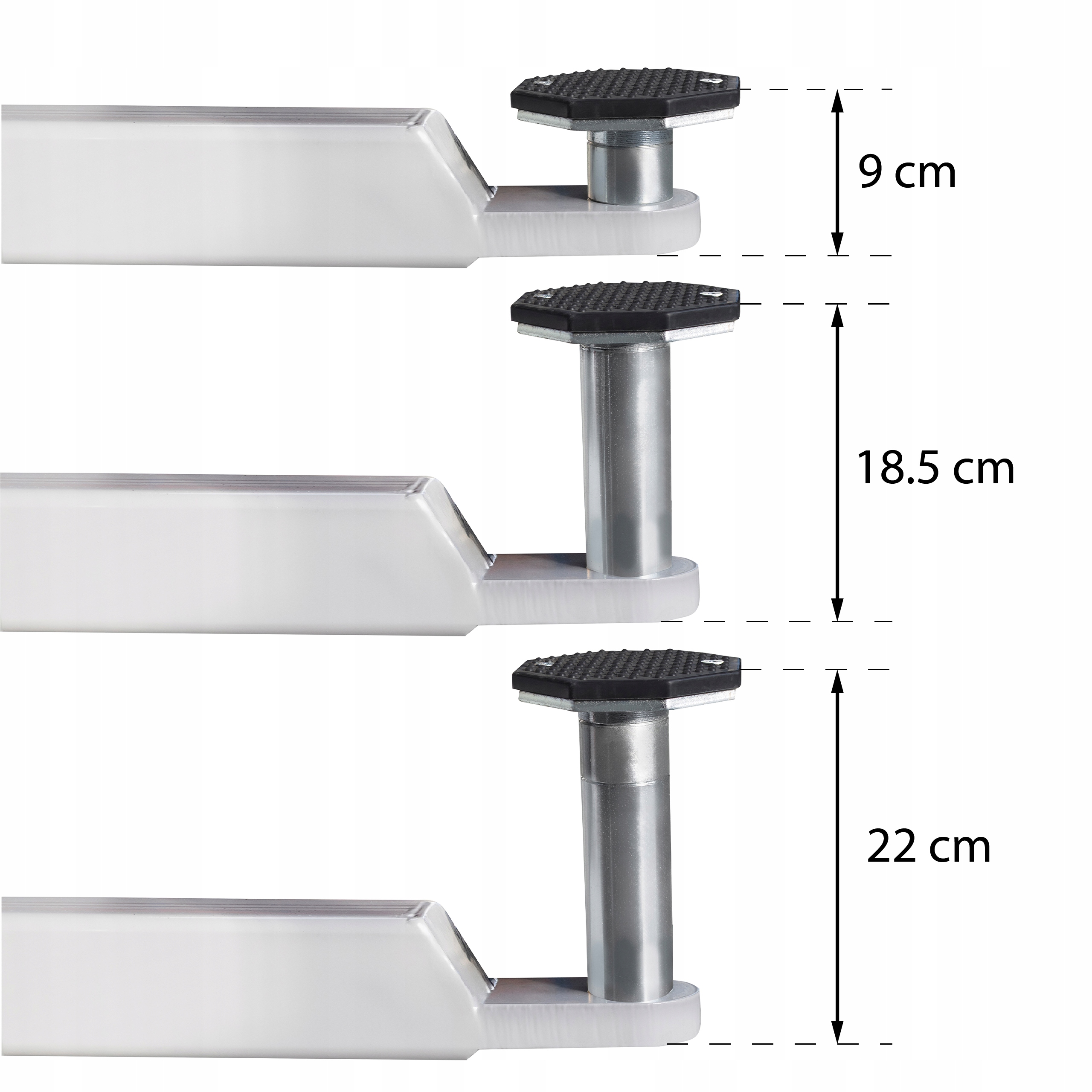 Підйомник оснащений гумовими накладками та комплектом подовжувачів, завдяки яким ми можемо регулювати їх висоту відповідно до транспортного засобу, що піднімається.