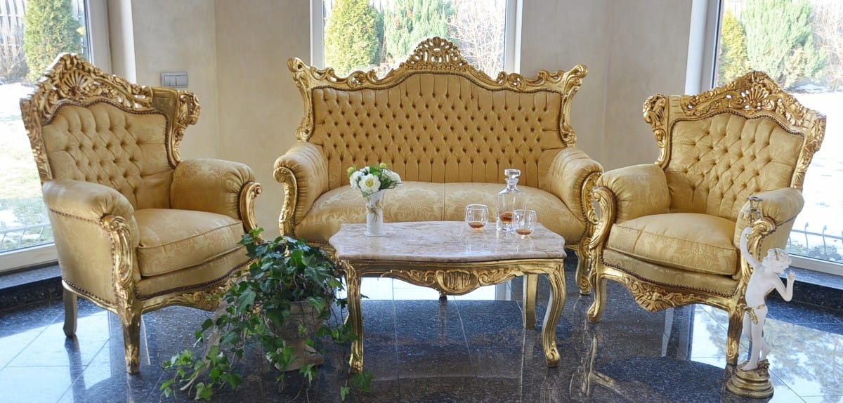 Стиль бароко дивана Людвіковська не відповідає жодному інтер’єру. Однак салон, прикрашений у цьому стилі, буде виглядати красиво, коли ми покладемо в нього набір цих смачних, золотистих меблів.