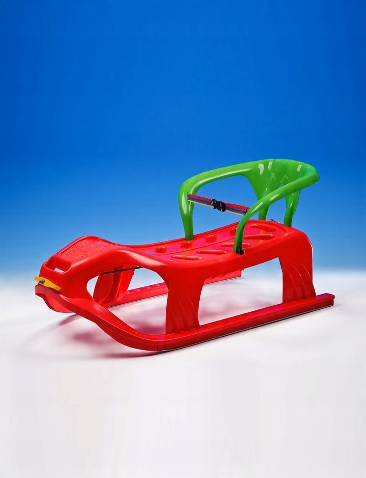 Це великі зручні двомісні сани з інноваційним рішенням для кріплення мотузки до ручки. Вони оснащені полозами з нержавіючої сталі, сучасної конструкції, обтічних форм і характеризуються точністю виготовлення, що забезпечує комфорт, безпеку та чудове задоволення на снігу.