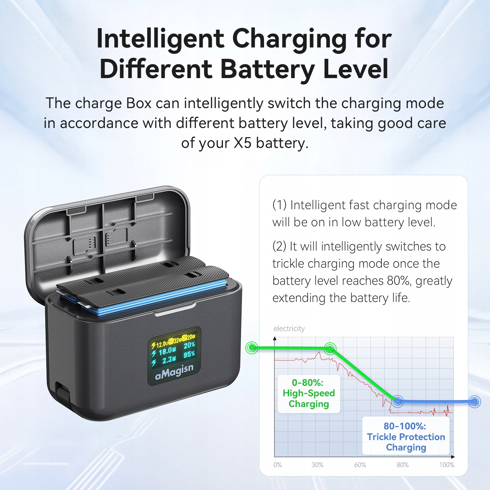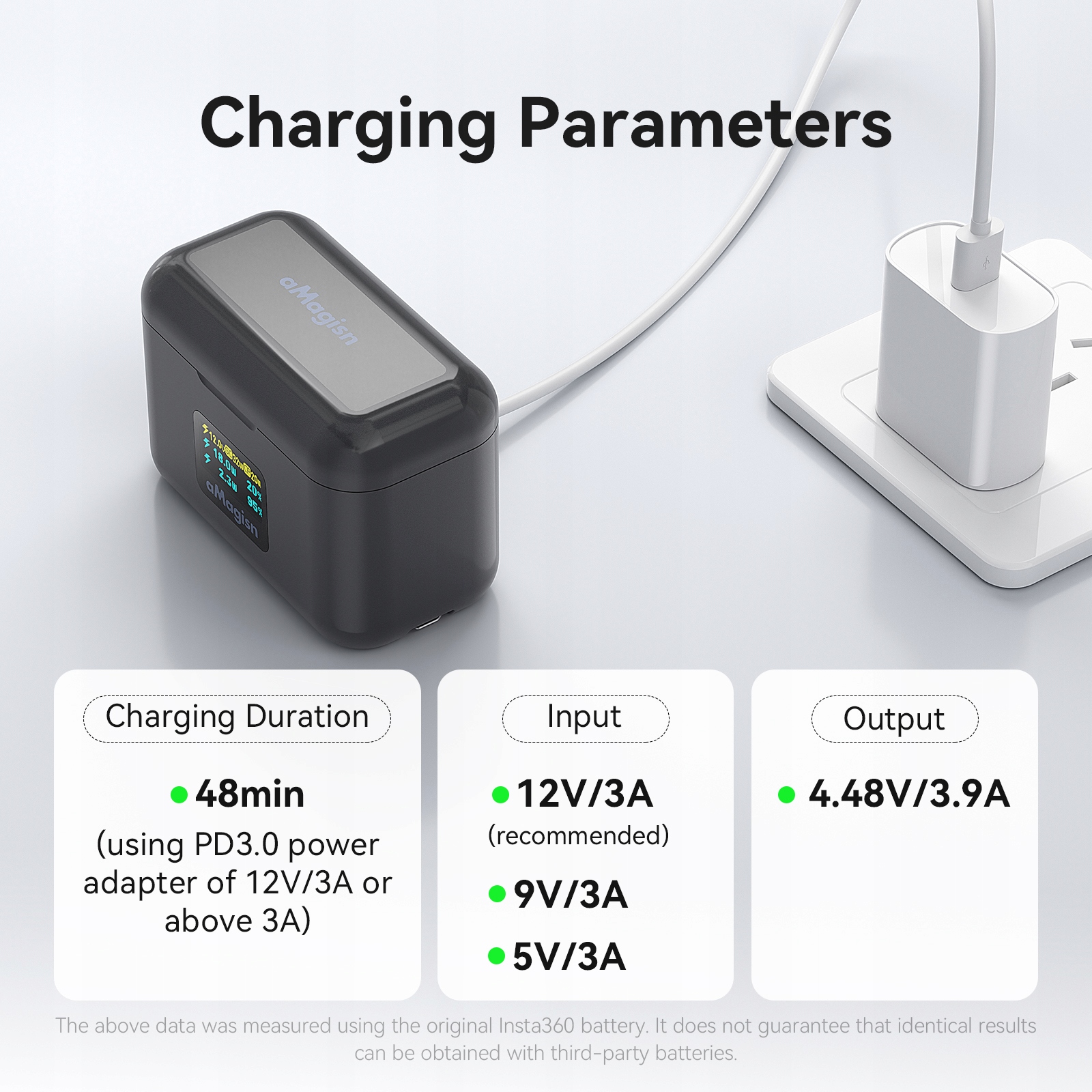 1:Зарядний пристрій 36 Вт: футляр для швидкого заряджання для Insta360 X5, PD3.0/2.0, макс. 36 Вт, 2×18 Вт. [80% за 29 хв, 100% за 48 хвтест за допомогою адаптера 12 В/3 А PD3.0]