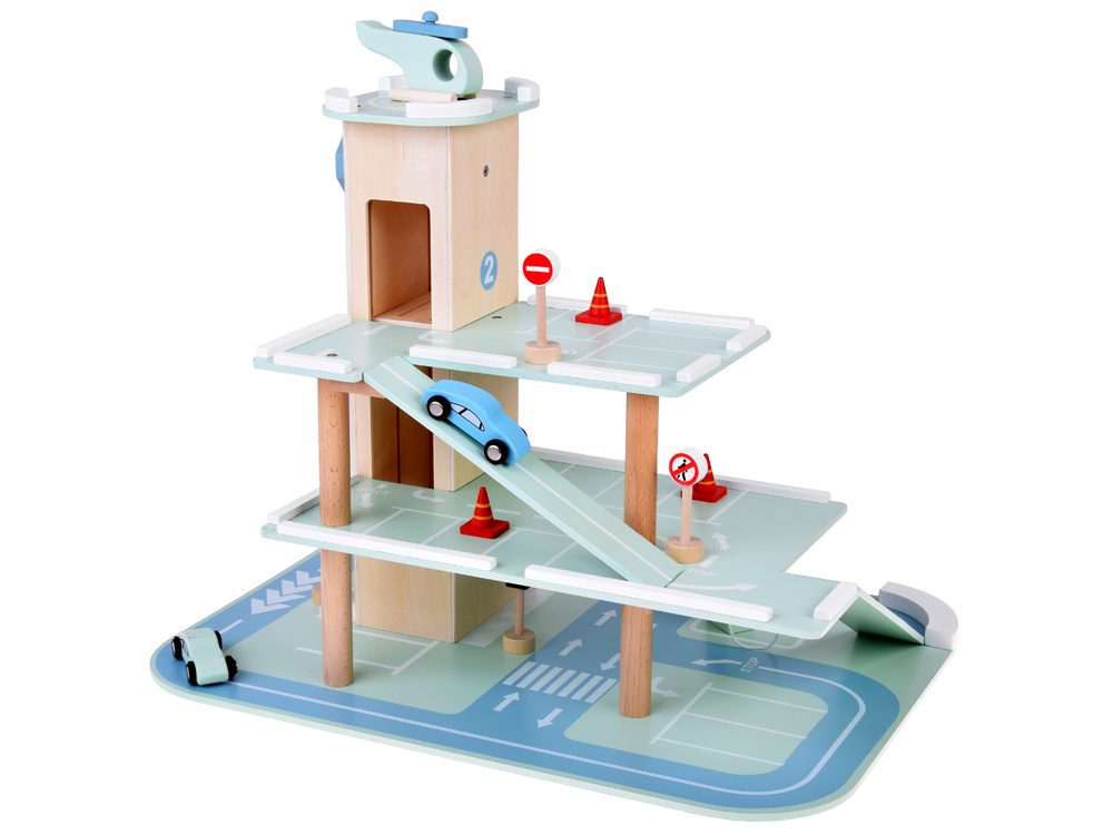 Гараж виготовлений з масиву дерева, частково покритий нетоксичною фарбою. Окремі елементи закруглені і не мають гострих країв, тому іграшка абсолютно безпечна для дитини. Високі підлоги полегшують доступ до всіх куточків і щілин, гарантуючи чудове задоволення. Поєднання натурального дерева з пастельними відтінками зеленого та блакитного надає паркінгу сучасний та естетичний вигляд. Чудово виглядатиме в будь-якій дитячій кімнаті.