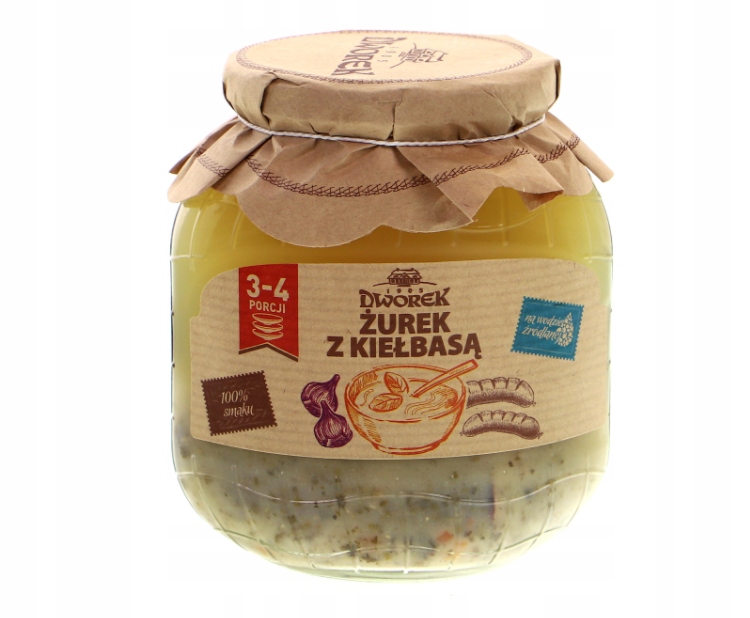 Кислий житній суп з ковбасою – це традиційний польський суп. Готовий суп - ідеальна ідея для швидкої вечері для сім'ї - з однієї баночки виходить 3-4 тарілки готової страви. Суп Dworek кислий житній з ковбасою виготовлений на джерельній воді, без консервантів, а також без ГМО. Кислий житній суп зі свининою – поживна страва, а додавання натуральних спецій надає йому неповторний смак і аромат. Готовий кислий житній суп із дворецькою ковбасою – гарна та швидка домашня вечеря.