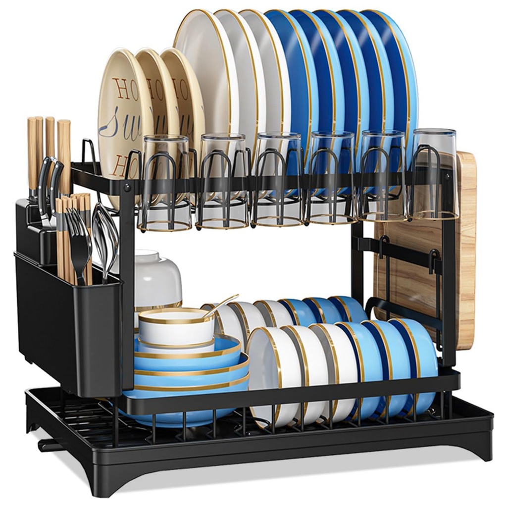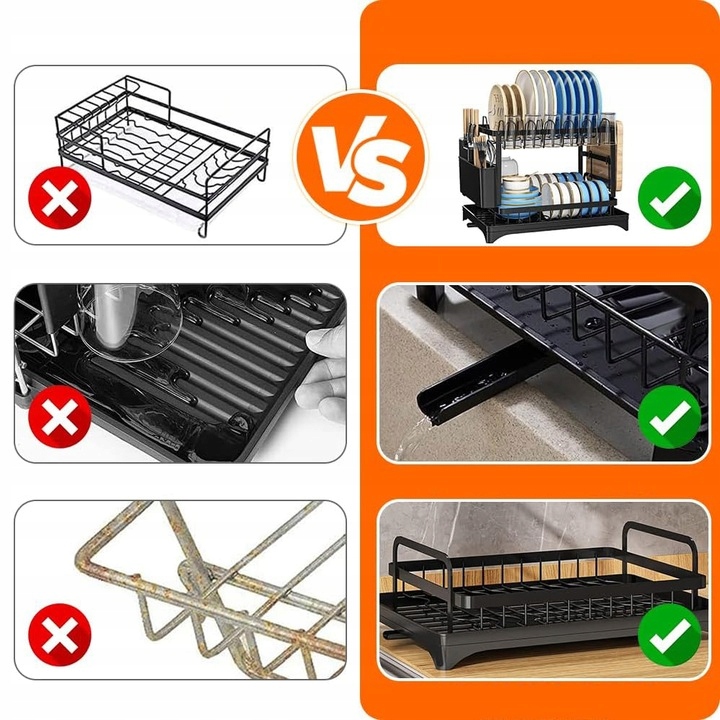- Дворівнева підставка для кухонного посуду також оснащена підстаканниками, підставкою для обробної дошки, підставкою для посуду з гачками та підставкою для повного посуду