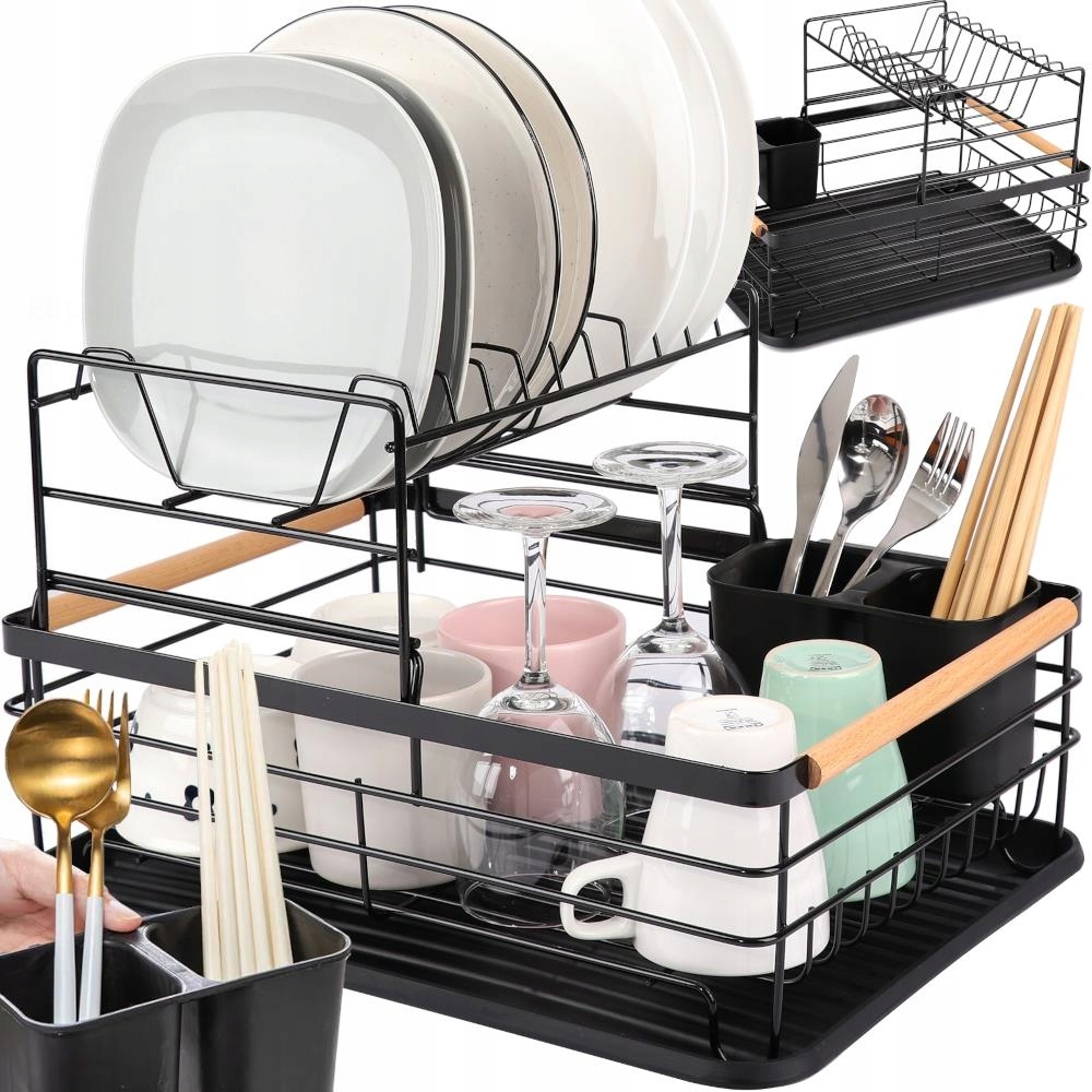 ✅Сушка для посуду характеризується дуже високою якістю та міцною та металевою конструкцією. Смоляний піддон захищає стільницю від намокання. У комплект також входить пластикова двокамерна сушарка для столових приборів. Металева чорна сушарка з дерев’яними ручками – це елегантне рішення для кожної кухні.