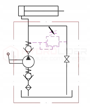 З одностороннього насоса виходить одна масляна заглушка, що дозволяє підключити односторонній привод. В однобічних приводах функцію повернення штока поршня виконує пружина або маса матеріалу, що піднімається; повернення поршневого штока можливе лише після відпускання зливного клапана в насосі.