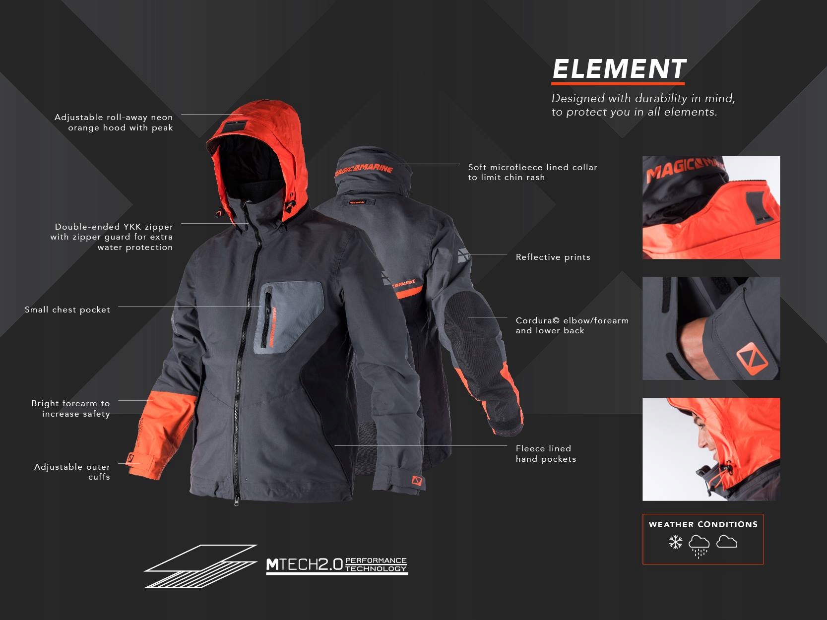 Вітрильна куртка розроблена за технологією MTECH2.0 Performance для створення вітронепроникної, водонепроникної та дихаючої оболонки зі спортивною контурною формою для найкращої посадки. Куртка була розроблена з урахуванням довговічності з міцними панелями Cordura© на ліктях/передпліччях і в нижній частині спини. Він також має покриту масивну подвійну передню блискавку YKK і високу горловину з мікрофлісовою підкладкою для максимального зручного використання та комфорту. Підкладка куртки виконана з вологопоглинаючого матеріалу та форми для підтримки комфорту та сухості під час використання. Включено кілька кишень для основних речей, кожна з яких виміряна для найкращої функціональності; кишені для рук на флісовій підкладці, маленька нагрудна кишеня та внутрішня кишеня. Яскравий нижній рукав на рукаві додає куртці елемент безпеки разом із смужкою на спині. Ця куртка була розроблена відповідно до асортименту Element, щоб усі елементи можна було комбінувати та поєднувати, а команди могли координувати свій комплект. Також доступні відповідні салопети, а також синя окантовка.