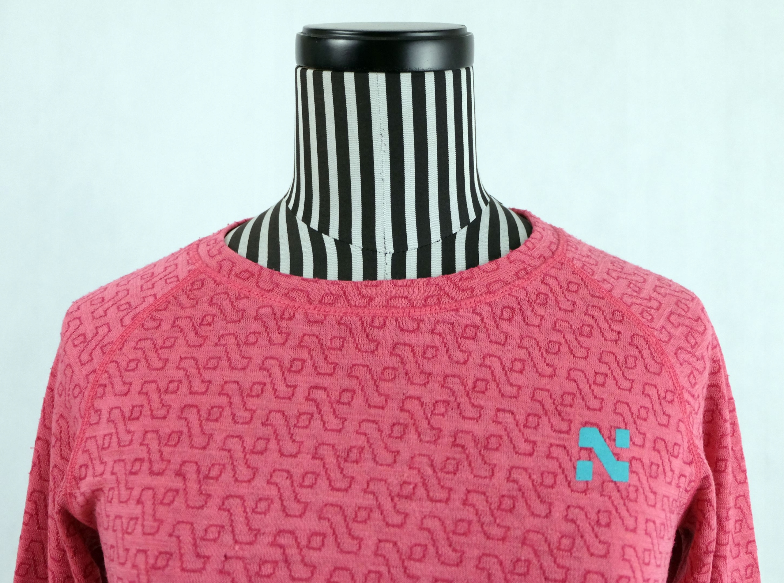 Двошарова термоактивна блуза з довгим рукавом з 55% мериносової вовни, мериносової вовни, малинового кольору з темно-малиновим логотипом. Внутрішній шар з поліестеру. Середній. Спинка довша. Плоскі шви темно-малинового кольору. Рукава реглан. Маленький з логотипом спереду. На манжеті одного рукава є маленька строчка. Чисте, випране в рідині для вовни.