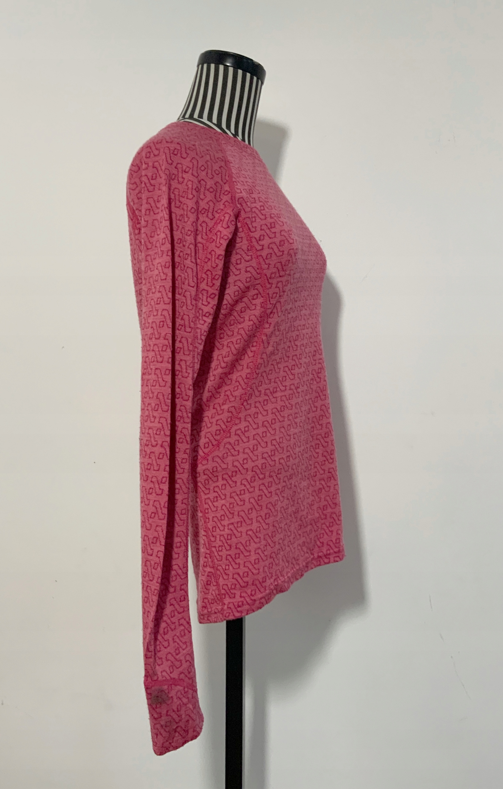 Двошарова термоактивна блуза з довгим рукавом з 55% мериносової вовни, світло-малинового кольору з темно-малиновим логотипом. Внутрішній шар з поліестеру. Середній. Спинка довша. Плоскі шви. Рукава реглан. Маленький з логотипом спереду. Хороший стан, одна манжета забруднена