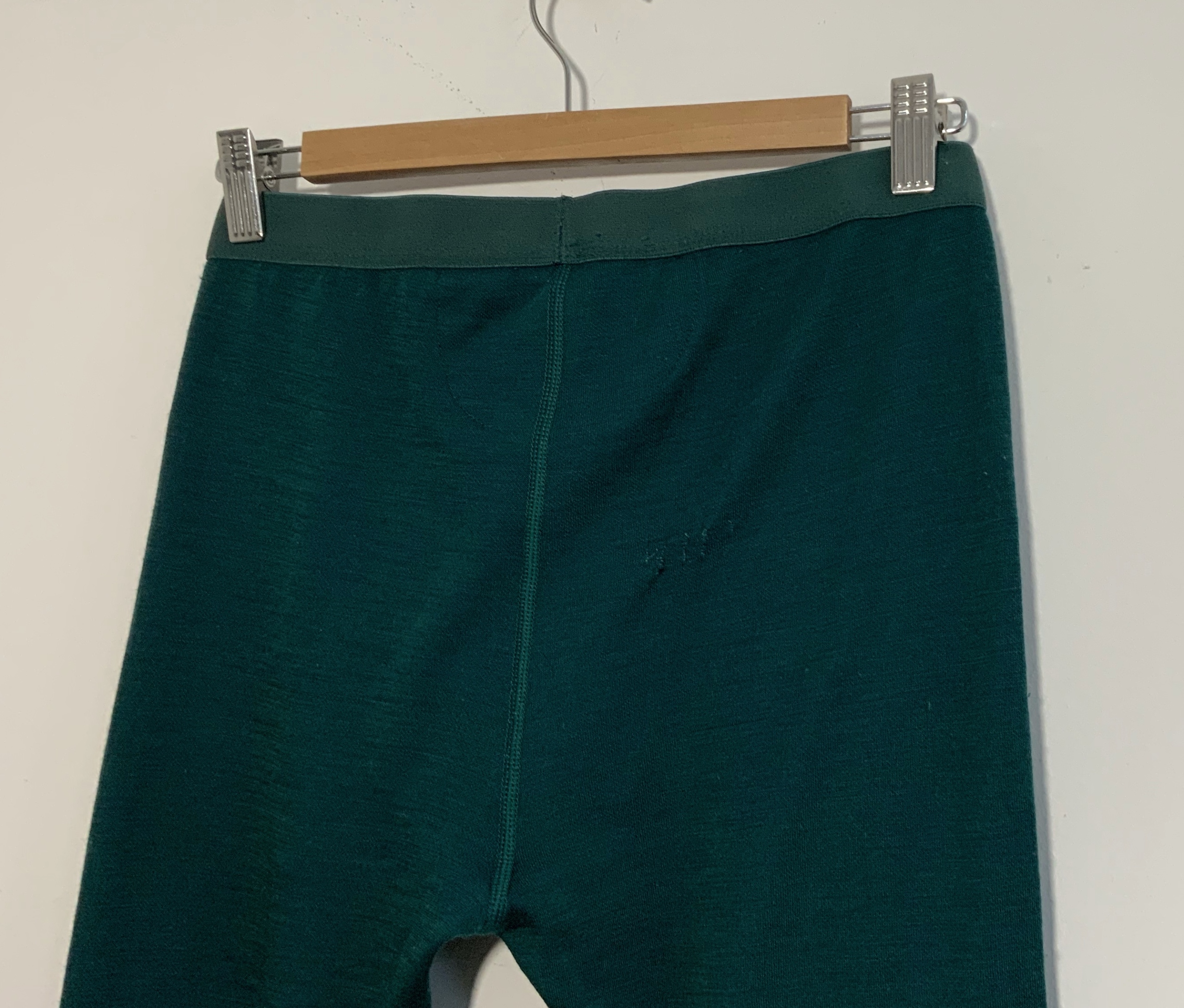Довгі двошарові термоактивні легінси. Зовнішній шар темно-зеленого кольору з мериносової вовни. Внутрішній шар темно-синього кольору з поліестеру. Середній. Гумка на талії. Спинка вище. Плоскі шви. Логотип на лівій нозі. Хороший стан, звороту з зеленої сторони строчки. Розмір з молодшої колекції.