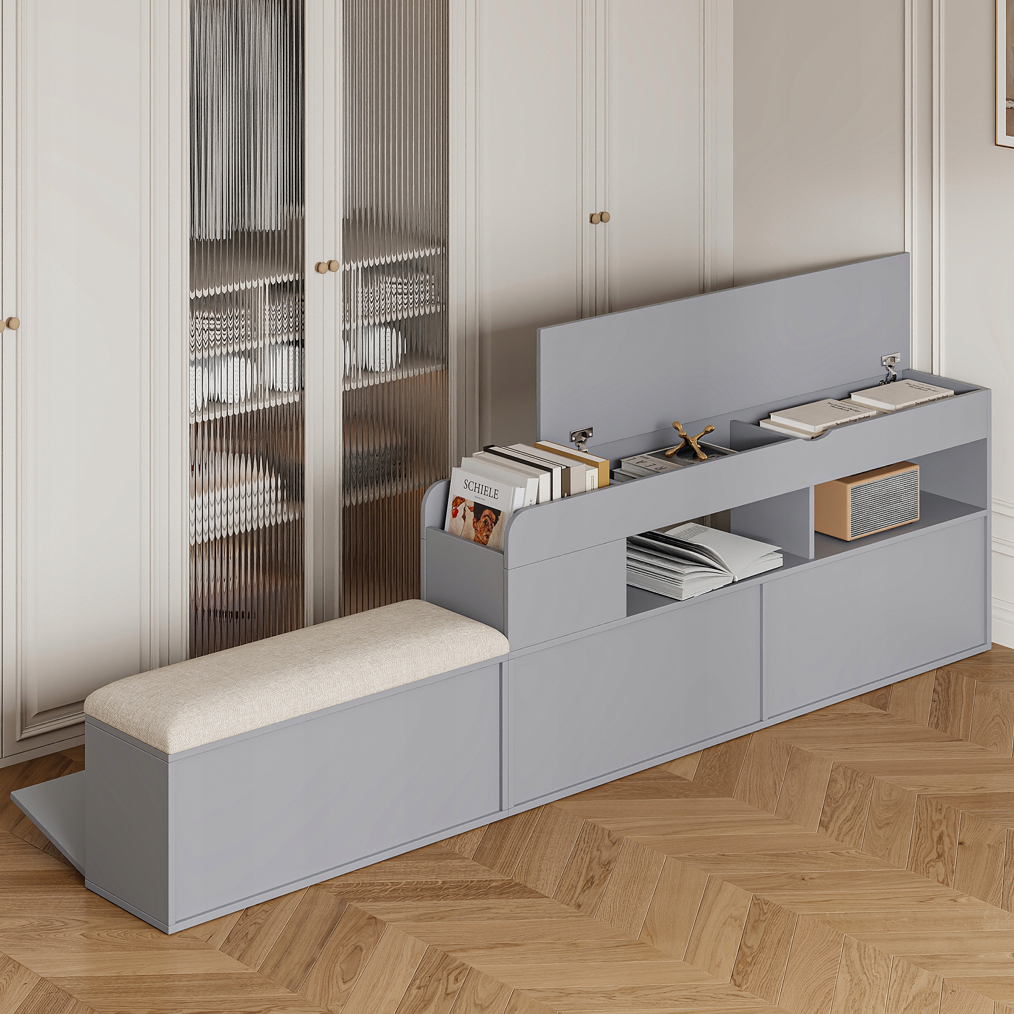 З сервантом, диваном-лавкою та тумбочкою – це ліжко постачається з відповідним напіввідкритим сервантом із місцем для зберігання збоку ліжка, який ідеально вписується в його дизайн і пропонує простір для лампи, книг або інших предметів на тумбочці. Додатковий простір для зберігання та полиці забезпечують лавка та невелика тумбочка.