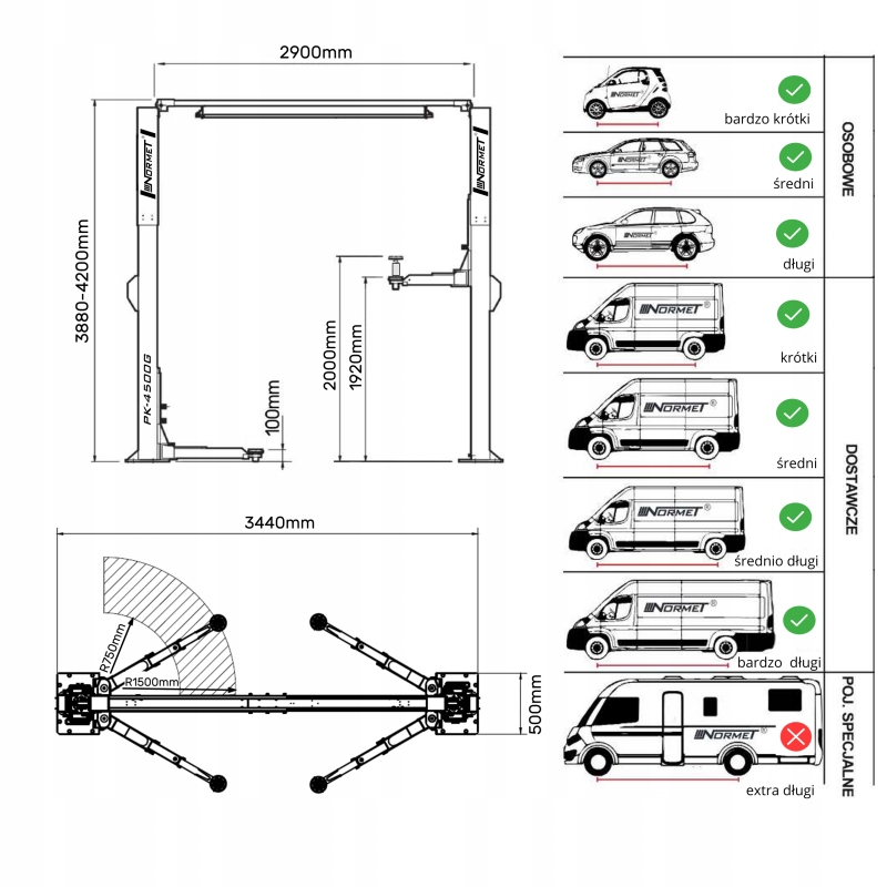 ПІДЙОМНИК ДВОКОЛОННИЙ АВТОМАТ NORMET PK-4500G 400V БУСИ ВИСОКИЙ 4,5Т