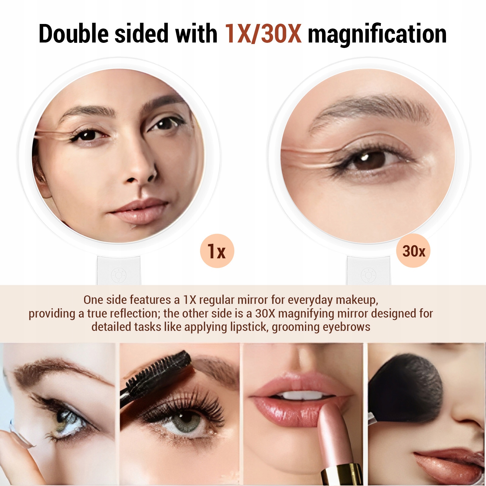 1. Подвійний функціональний дизайн: відчуйте зручність стандартного 1-кратного дзеркала з одного боку для щоденного макіяжу, доповненого 30-кратним збільшенням для таких ретельних завдань, як формування брів, нанесення губної помади, догляд за шкірою або гоління.
