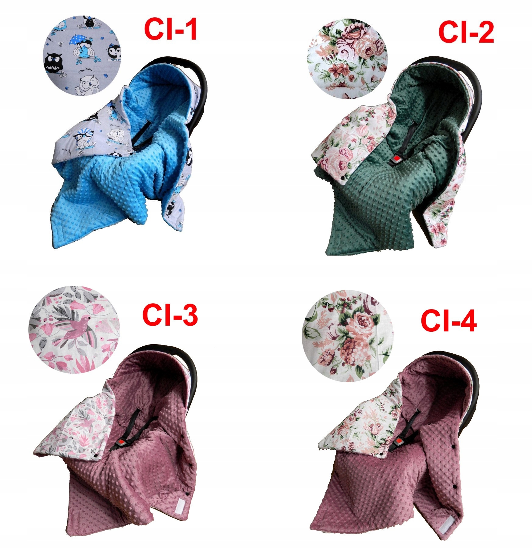 2-стороння , має вшиті липучки та застібки, які дозволяють ковдру помістити на дитину. Виїмки дозволяють переносити як 3-, так і 5-точкові ремені безпеки / окремі /