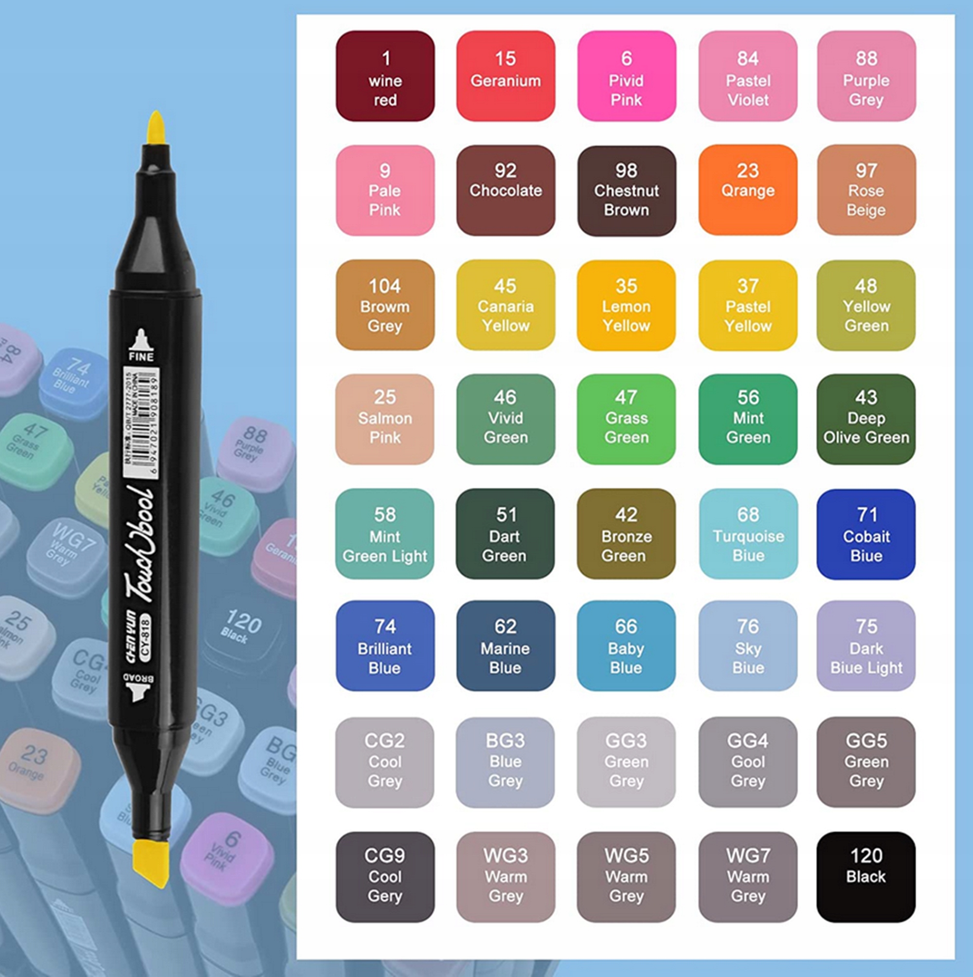 Набір кольорів маркерів підібрано таким чином, щоб їх можна було використовувати в різних сферах малювання: від дизайну одягу до дизайну виробів, архітектурні малюнки, пейзажі та манга. Спробуйте та висловіть свою творчість!