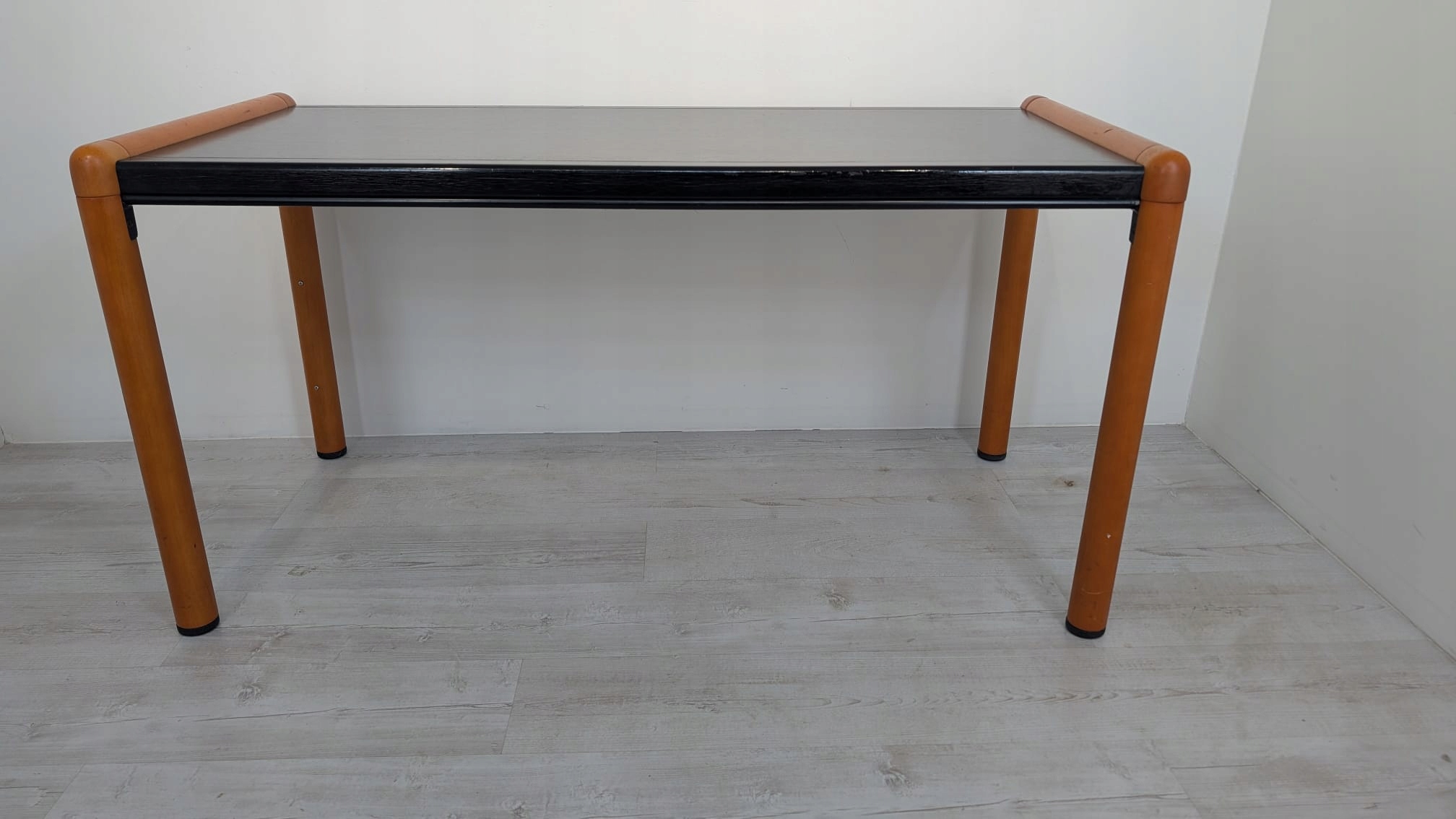 Стильний, двосторонній, модерністський стіл у стилі середини століття. Стільниця чорна, ніжки дерев'яні. Меблі в хорошому стані, придатні для використання вдома чи в офісі.