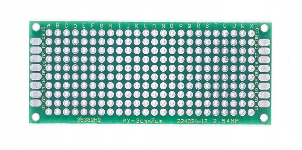 Двостороння універсальна дошка з високоякісного ламінату FR-4 товщиною 1,6 мм. Ми можемо легко зібрати та розібрати будь-яку електронну схему на універсальній платі без необхідності проектування, травлення чи замовлення спеціальної друкованої плати. Ідеально підходить для створення електричних і електронних систем і прототипів із використанням елементів із наскрізним отвором (THT).
