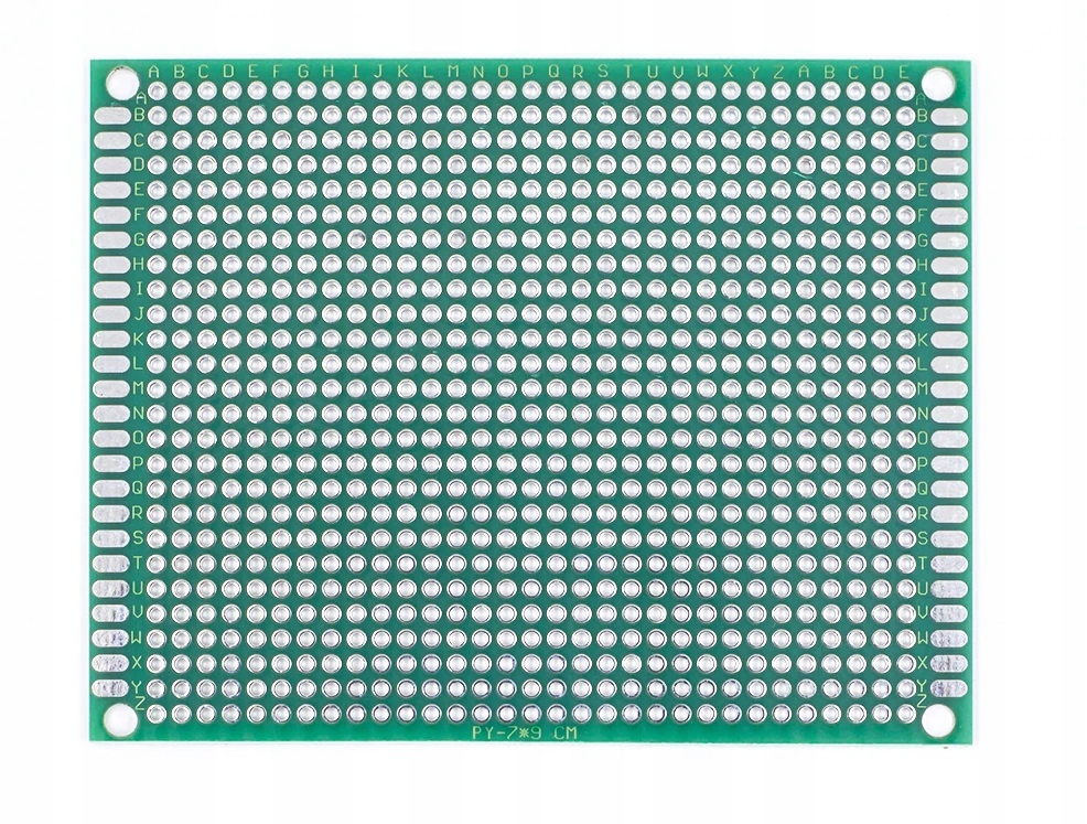 Двостороння універсальна дошка з високоякісного ламінату FR-4 товщиною 1,6 мм. Ми можемо легко зібрати та розібрати будь-яку електронну схему на універсальній платі без необхідності проектування, травлення чи замовлення спеціальної друкованої плати. Ідеально підходить для створення електричних та електронних систем і прототипів із використанням елементів із наскрізним отвором (THT).
