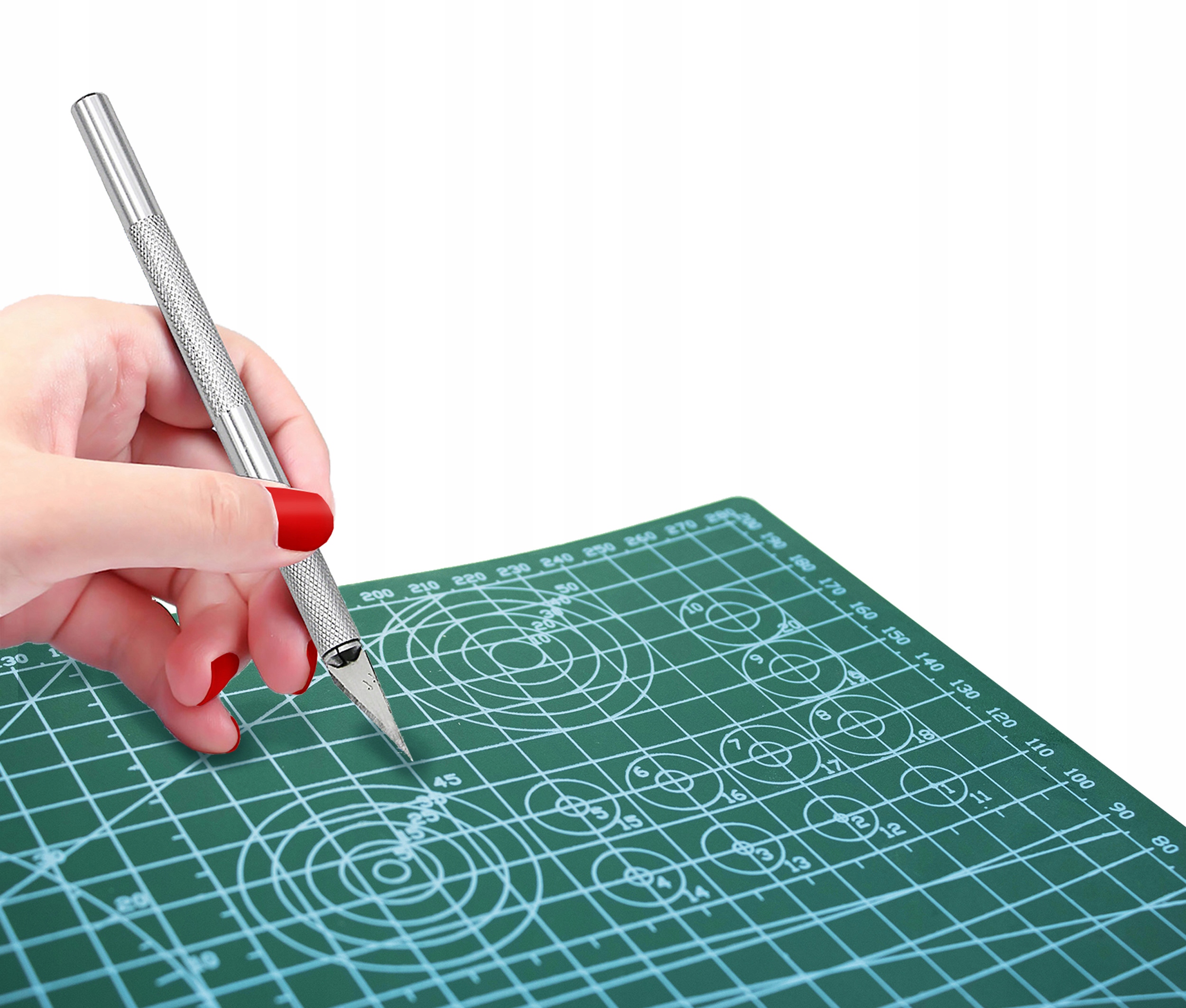 Килимок має позначені сантиметри, які допомагають виміряти ідеальний розмір. Тут також є посібники для вимірювання кутів, необхідних для вирізання геометричних фігур.
