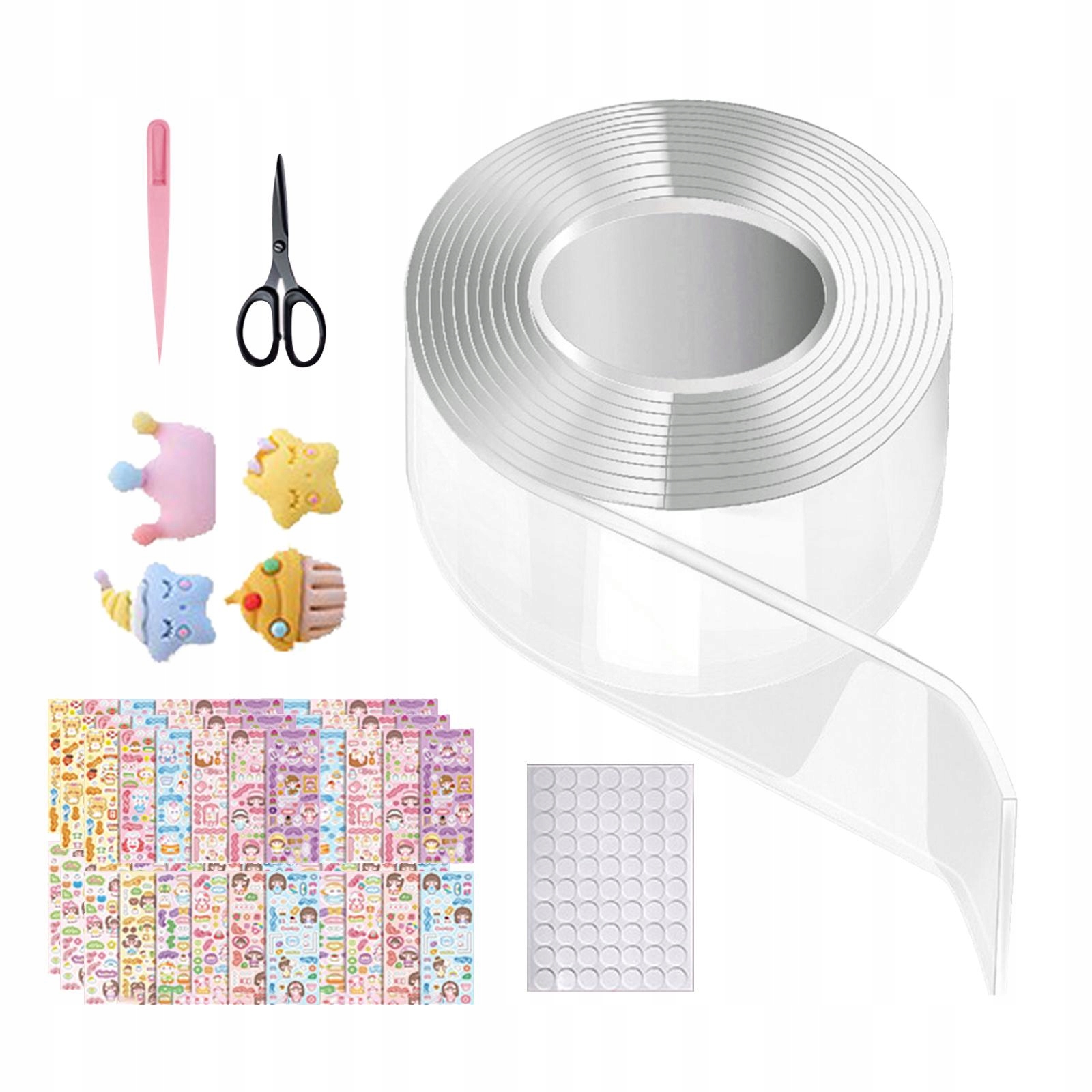 1 рулон стрічки, 4 наклейки з мультфільмами (довільно), 1 аркуш двосторонніх точкових наклейок, 60 аркушів наклейок, 1 ножиці, 1 пінцет.