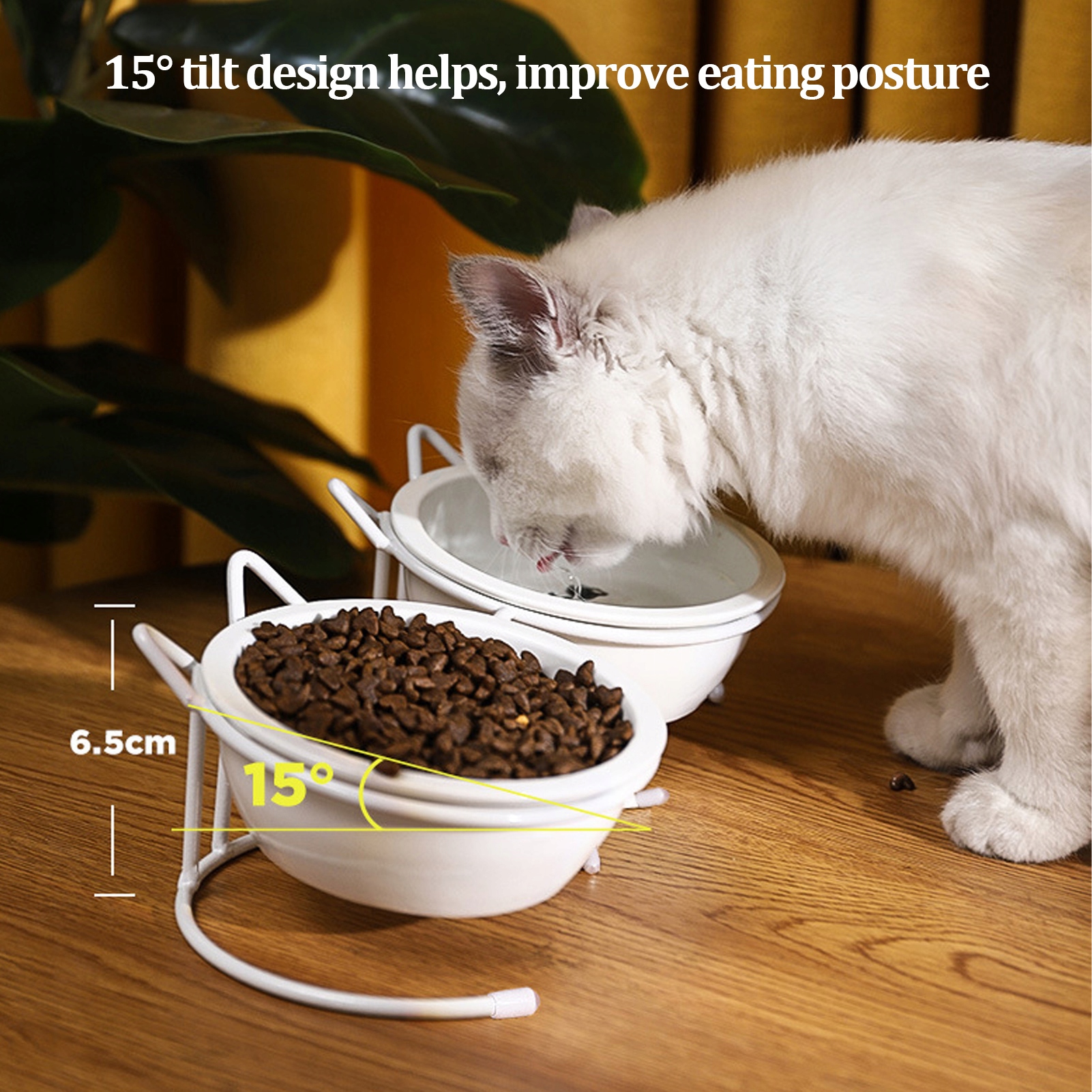 1. Зменшіть навантаження на шию: подвійна керамічна миска з металевою підставкою, яка піднімає миску для кота до більш зручної висоти, що дозволяє коту вибирати та погіршити їх випадкову блювоту.