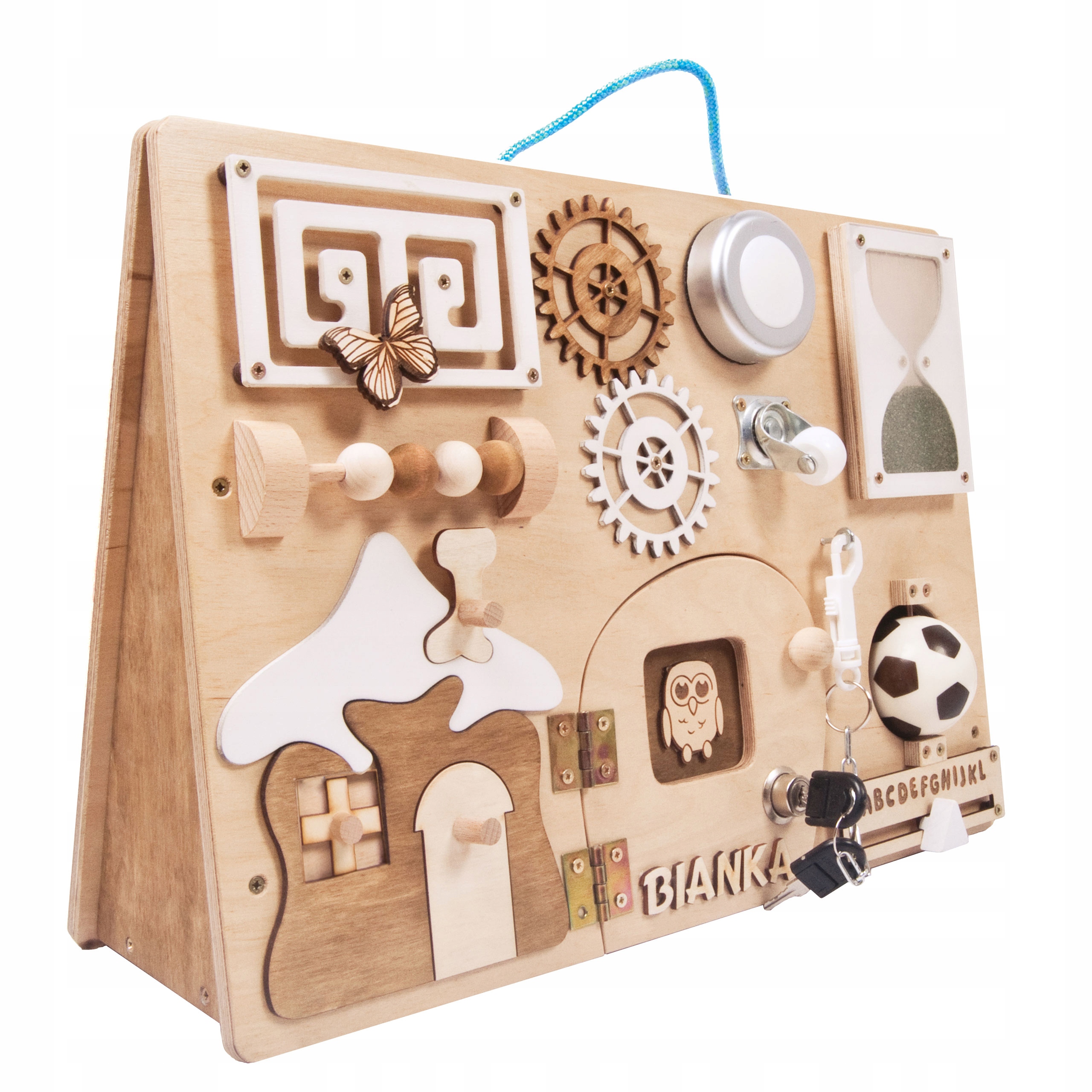 - Завдяки двом сторонам і великій кількості елементів різного ступеня складності дошка може використовувати більше дітей різного віку, і кожен знайде щось для себе.