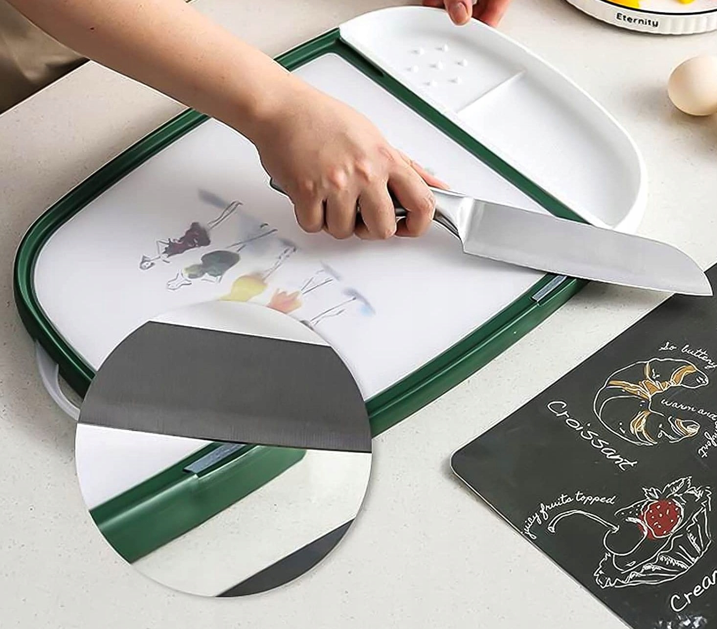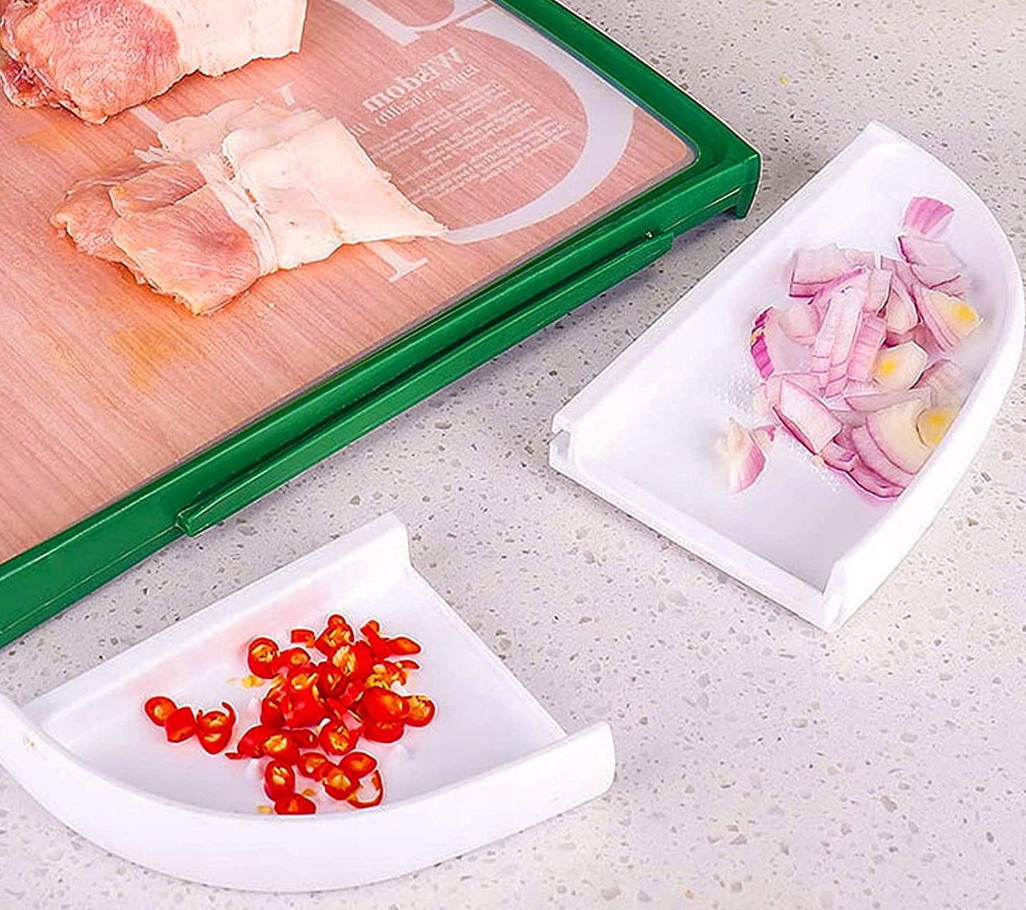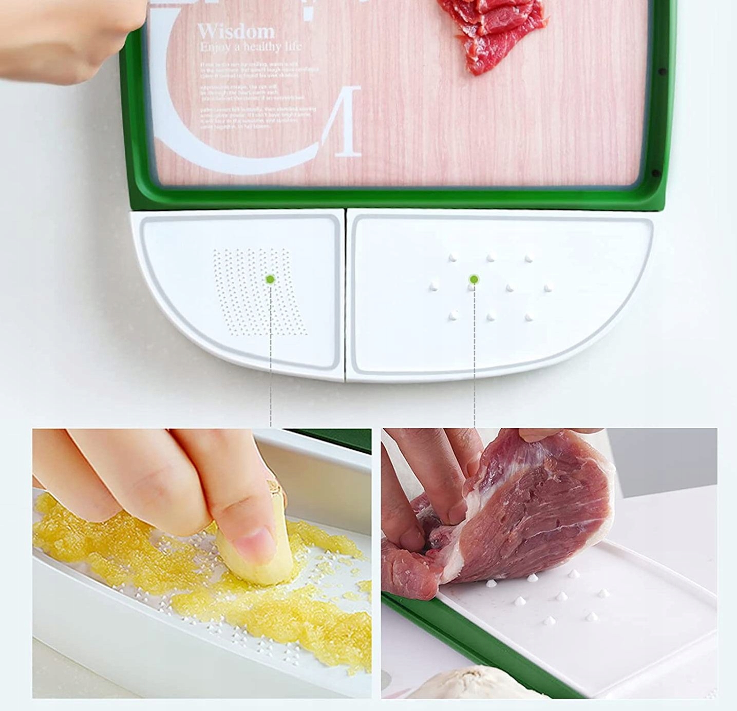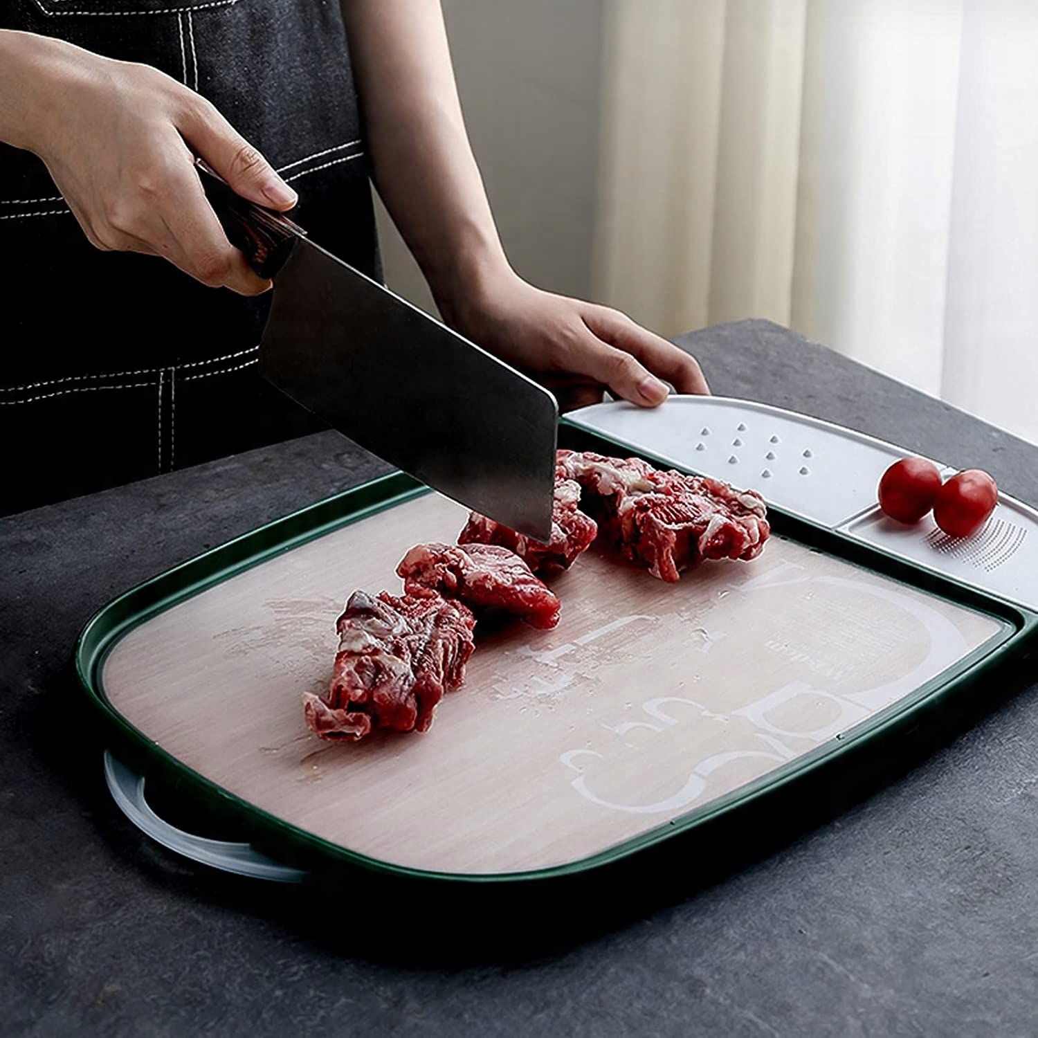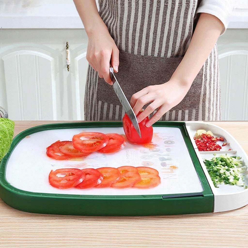 Обробна дошка переосмислює функціональність обробних дощок завдяки своєму інноваційному дизайну та вбудованим контейнерам, які надають більше простору для роботи, дозволяючи зручно нарізати без безладу.