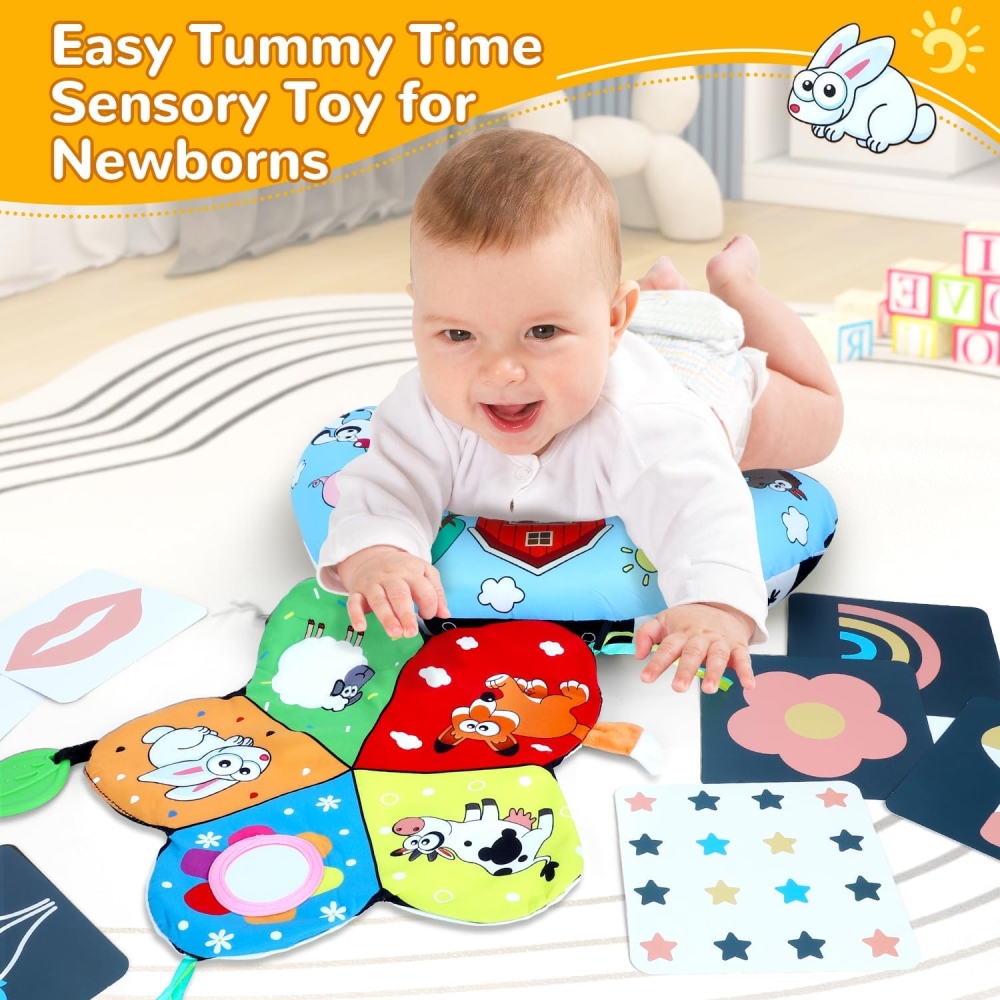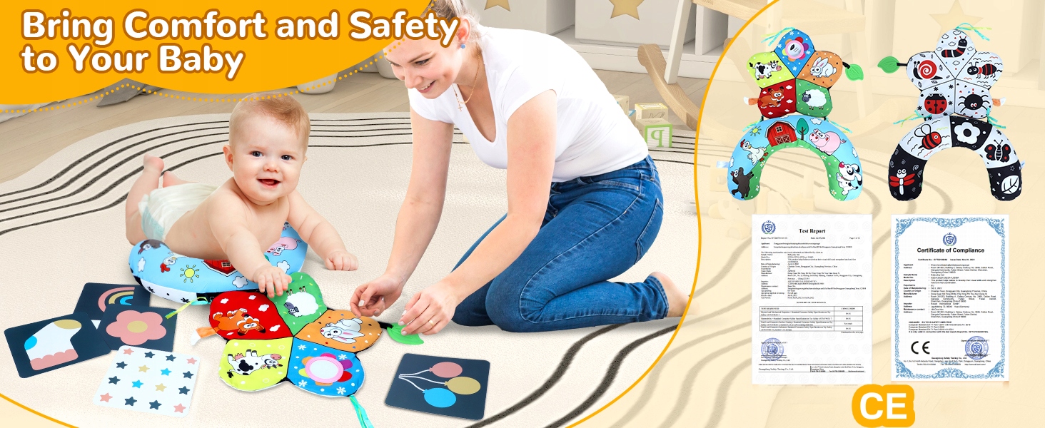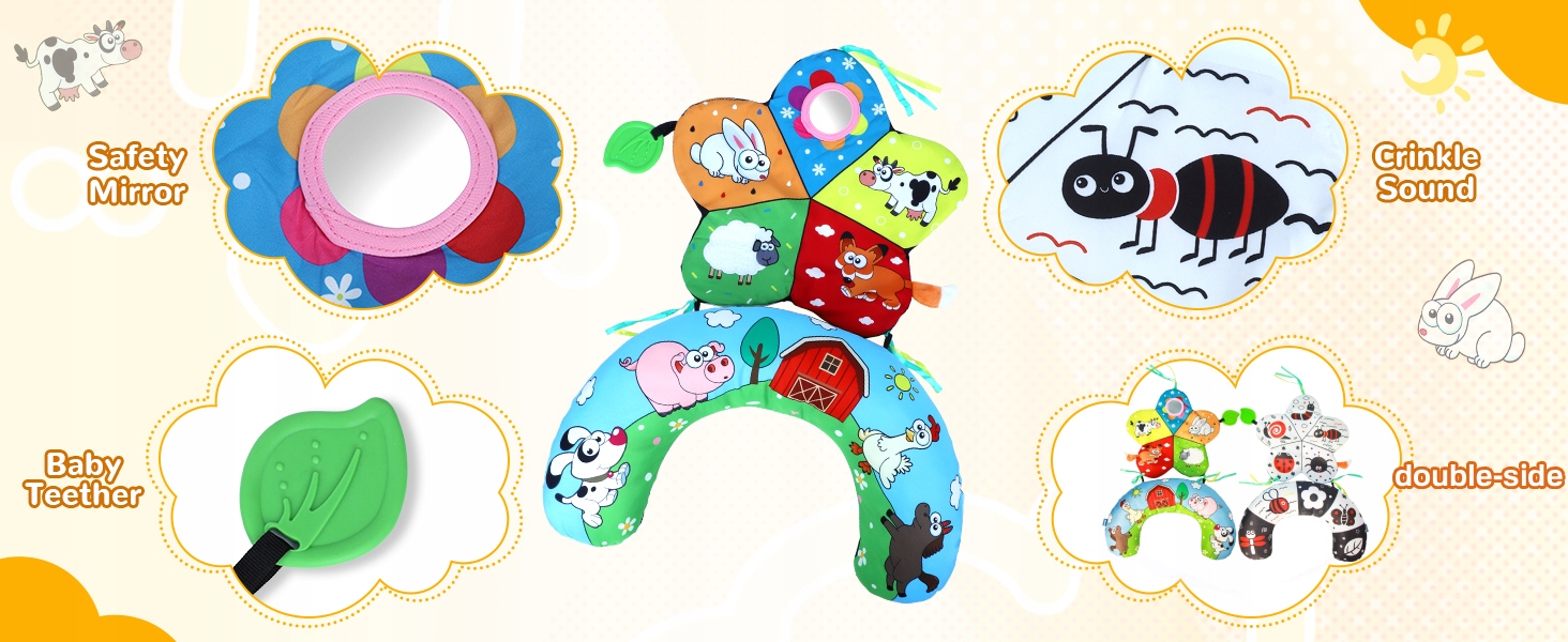 - Цей набір подушок і килимка для живіт включає знімні сенсорні іграшки (дитячі прорізувачі, іграшки-дзеркала), виготовлені з безпечних для дітей матеріалів для веселих і безпечних ігор.