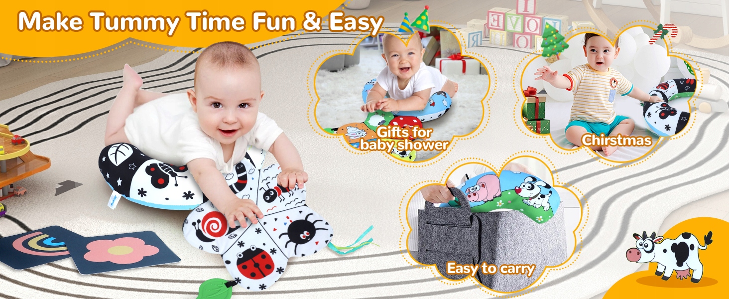 - Ця універсальна іграшка-подушка розроблена, щоб допомогти немовлятам розвинути силу м’язів і ключові рухові навички, такі як контроль голови, перевертання та повзання – усі ключові віхи.