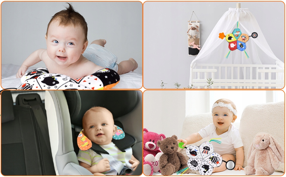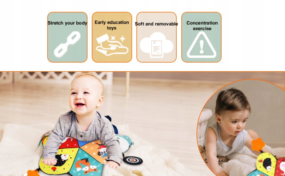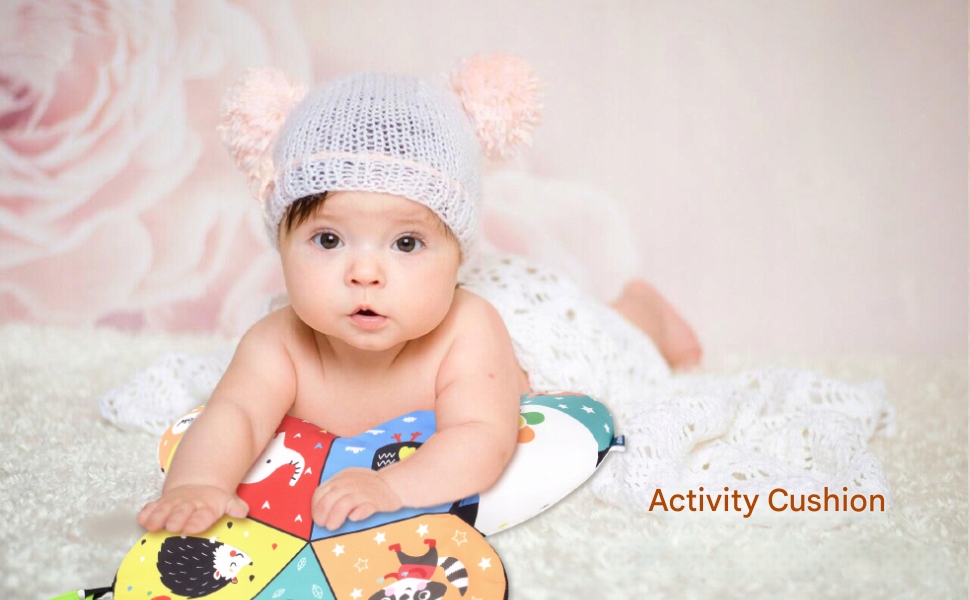 - Зручна подушка у формі півмісяця підтримує малюків, дозволяючи їм гратися на животику або сидіти, зменшуючи розчарування.