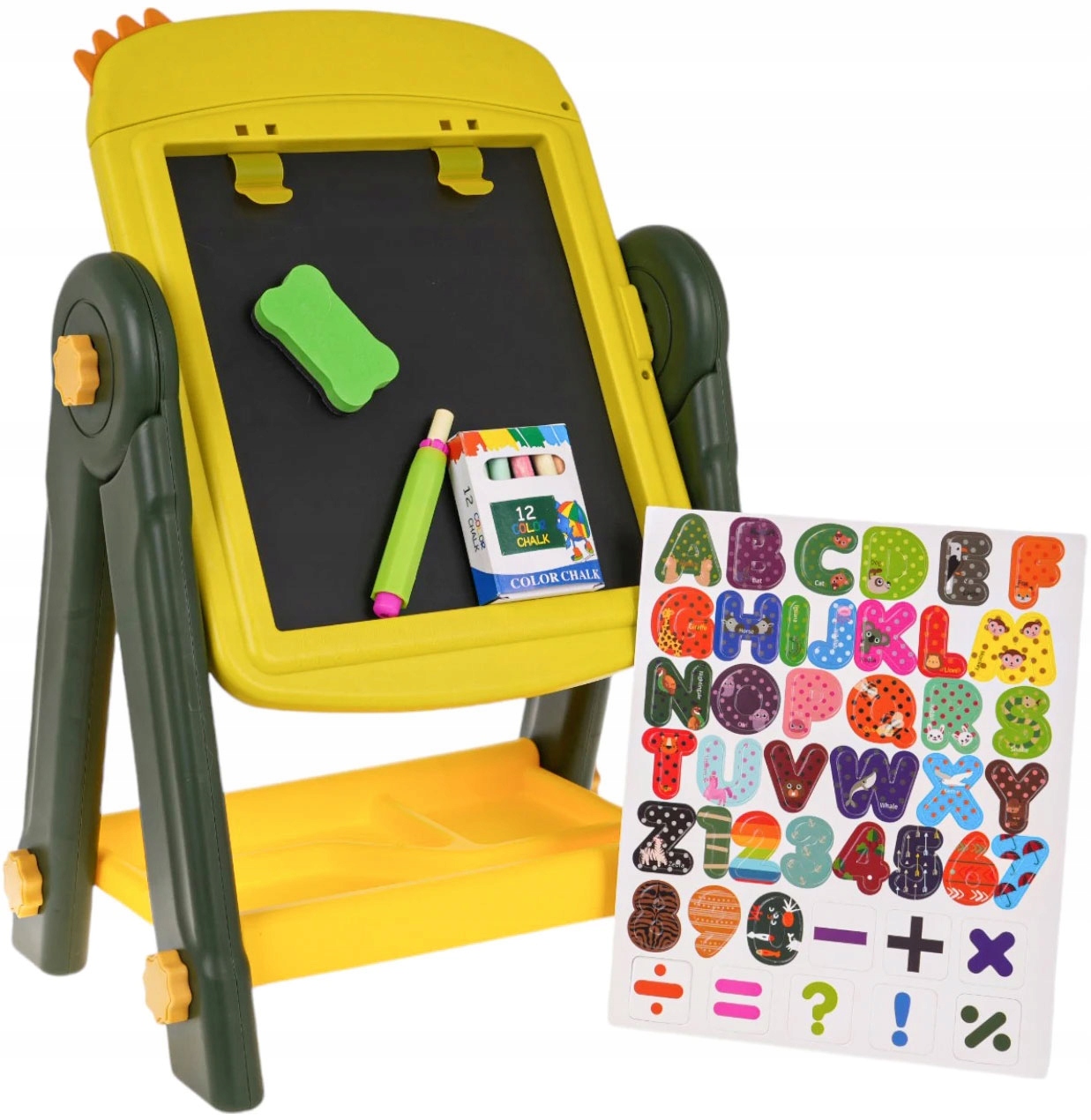двостороння плата на підставці з аксесуарами для дітей віком від 3 років. Дизайн стійки стабільний і простий у встановленні. Дошки з обох боків магнітні, ви можете прикріпити магніти від набору до них. На чорній стороні він малює крейду, а на білих фетрових ручках. Набір включає крейду, крейду, маркер та магніти з літерами, цифрами та математичною діяльністю. Практична полиця для аксесуарів, доступних у наборі, була розміщена під дошкою. На білій стороні зверху прикріплені дві затискачі, до яких ми можемо прикріпити аркуш паперу. Набір розвиває ручні навички, вправи.