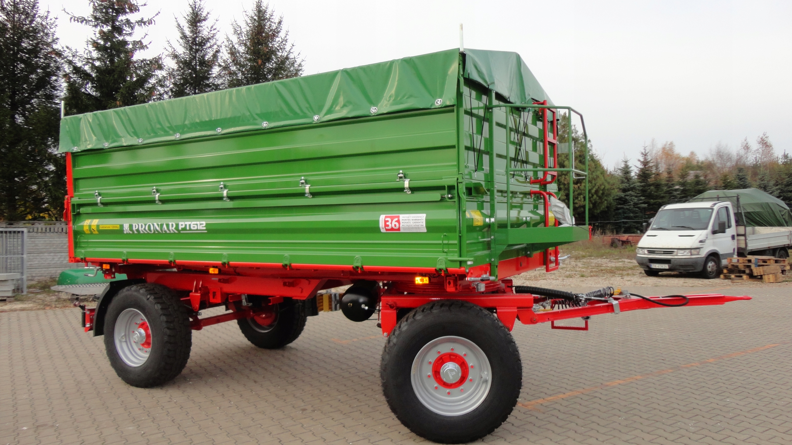 Причіп використовує навантажувальну коробку з сильними плитами підлоги, а довговічні, профільовані стіни є центральними. Він оснащений тристороннім механізмом. Кросівки в задній стінці полегшують розвантаження сільськогосподарських продуктів та матеріалів, або вільні будівельні матеріали (наприклад, пісок) та відстань між платформою та землею (між 1142 мм і 1270 мм) значно полегшують завантаження. Конструкція рами шасі заснована на довговічних прямокутних закритих профілях, що забезпечує міцність. Швидкість проектування причепа Pronar PT612 становить 40 км/год, вибір - це пневматична або гідравлічна установка гальма. Підвіска, осі, параболічні джерела та освітлення були розроблені для задоволення вимог швидкості будівництва. Високоякісні матеріали використовувались для виробництва, включаючи сучасні двокомпонентні фарбові покриття. Транспорт з використанням двосайкових причепів популярний як в сільському господарстві, так і в муніципальній економіці.