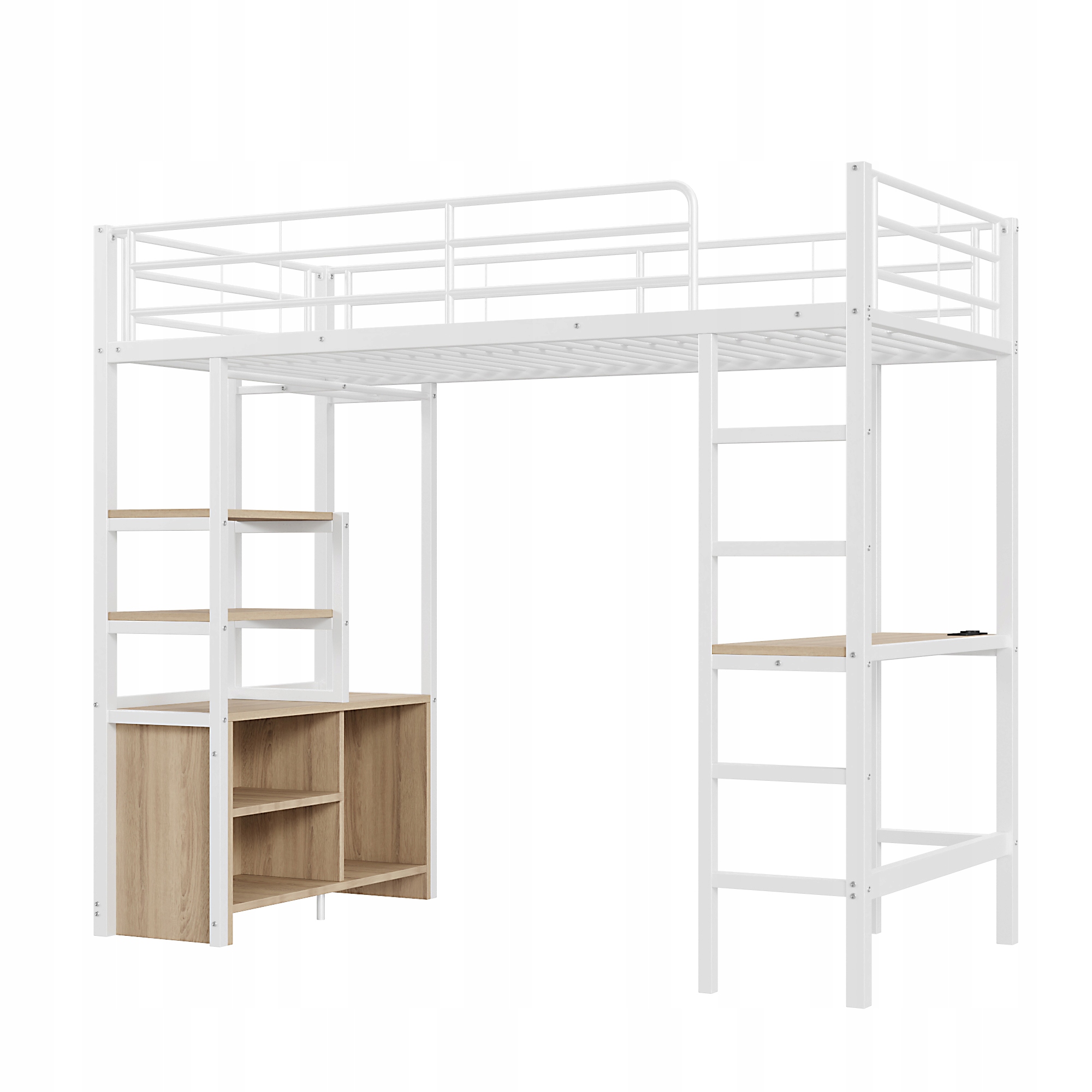 ліжко на антресолі 90*200 см, без матраца, ліжко з столом, з розеткою та USB, декількома полицями, відкритою шафою для зберігання, порушеннями, драбиною, залізною рамкою, білим