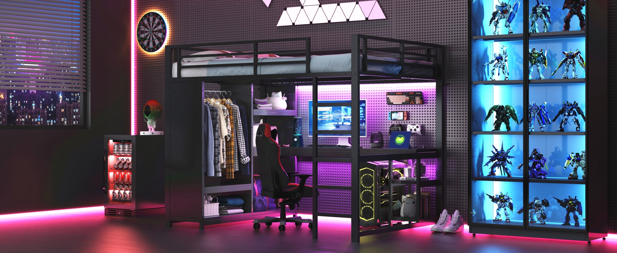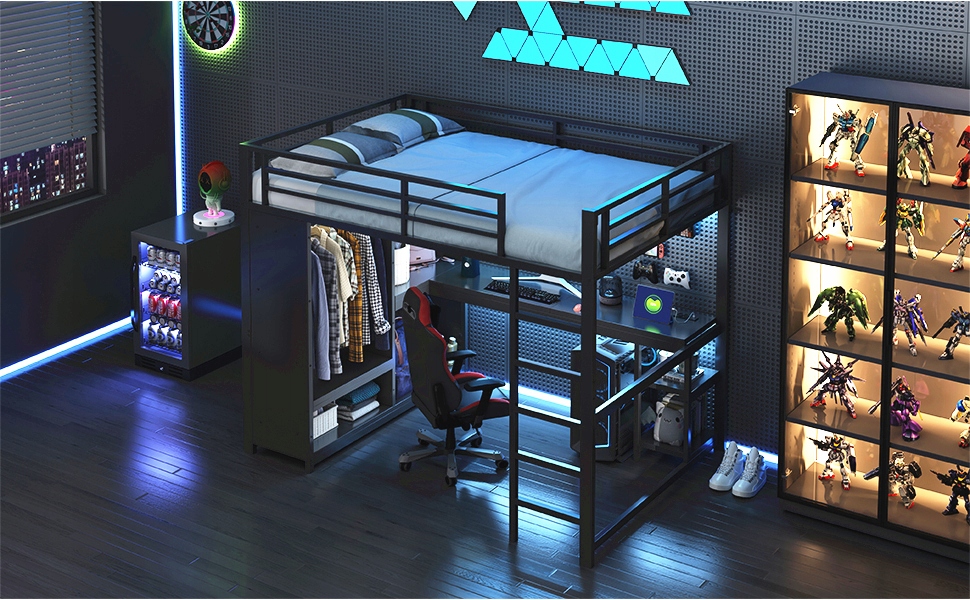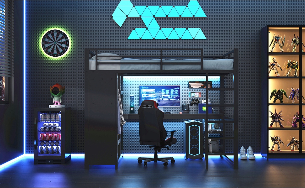 - Полиця над столом оснащена світлодіодним освітленням, колір якого можна регулювати за допомогою програми Bluetooth. У поєднанні з функцією заряджання столу це ліжко забезпечить вам комфорт під час роботи та гри.