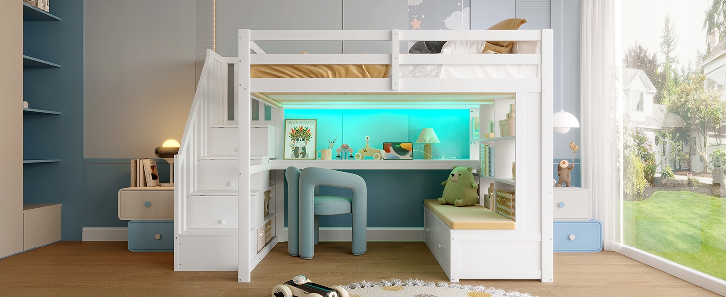 - Інтегроване світлодіодне освітлення під ліжком додає живого візуального акценту у вашу кімнату. Регульовані налаштування кольору світла дозволяють легко відповідати світлу до настрою чи діяльності, незалежно від того, відпочиньте, читайте, якщо ви працюєте ввечері. Вибирайте з широкого спектру кольорів та світлих ефектів, щоб створити ідеальну атмосферу. 4 Двоярусне ліжко оснащене бар'єром для додаткової безпеки, і ви можете ввести його на тверді, похилі сходи. Насолоджуйтесь років відпочинку та сімейних розваг у цьому ретельно розробленому дерев’яному ліжку.