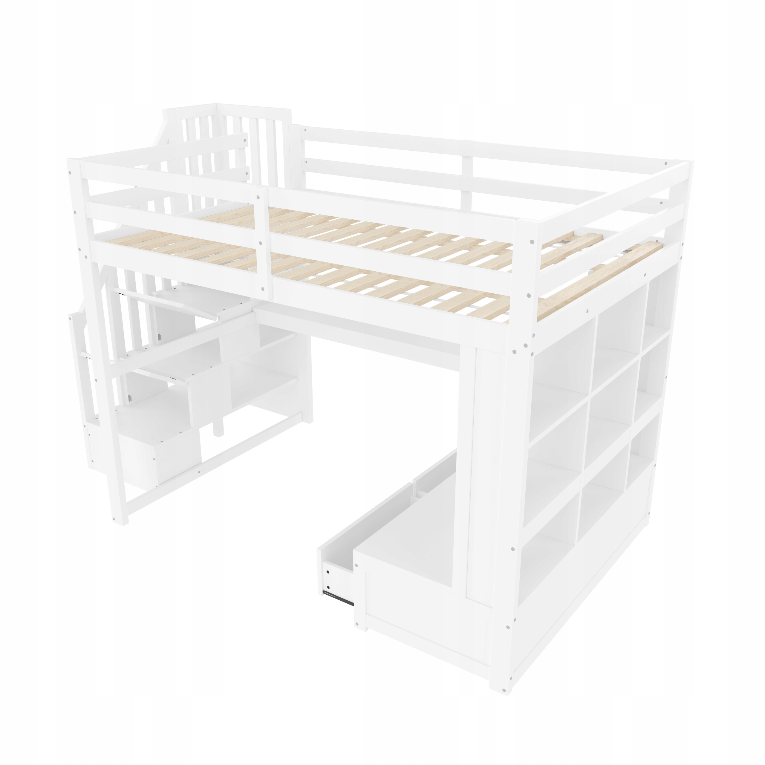 двоярусне ліжко 140x200 з столом і поличками, двома побудованими ящиками, сходами, білим